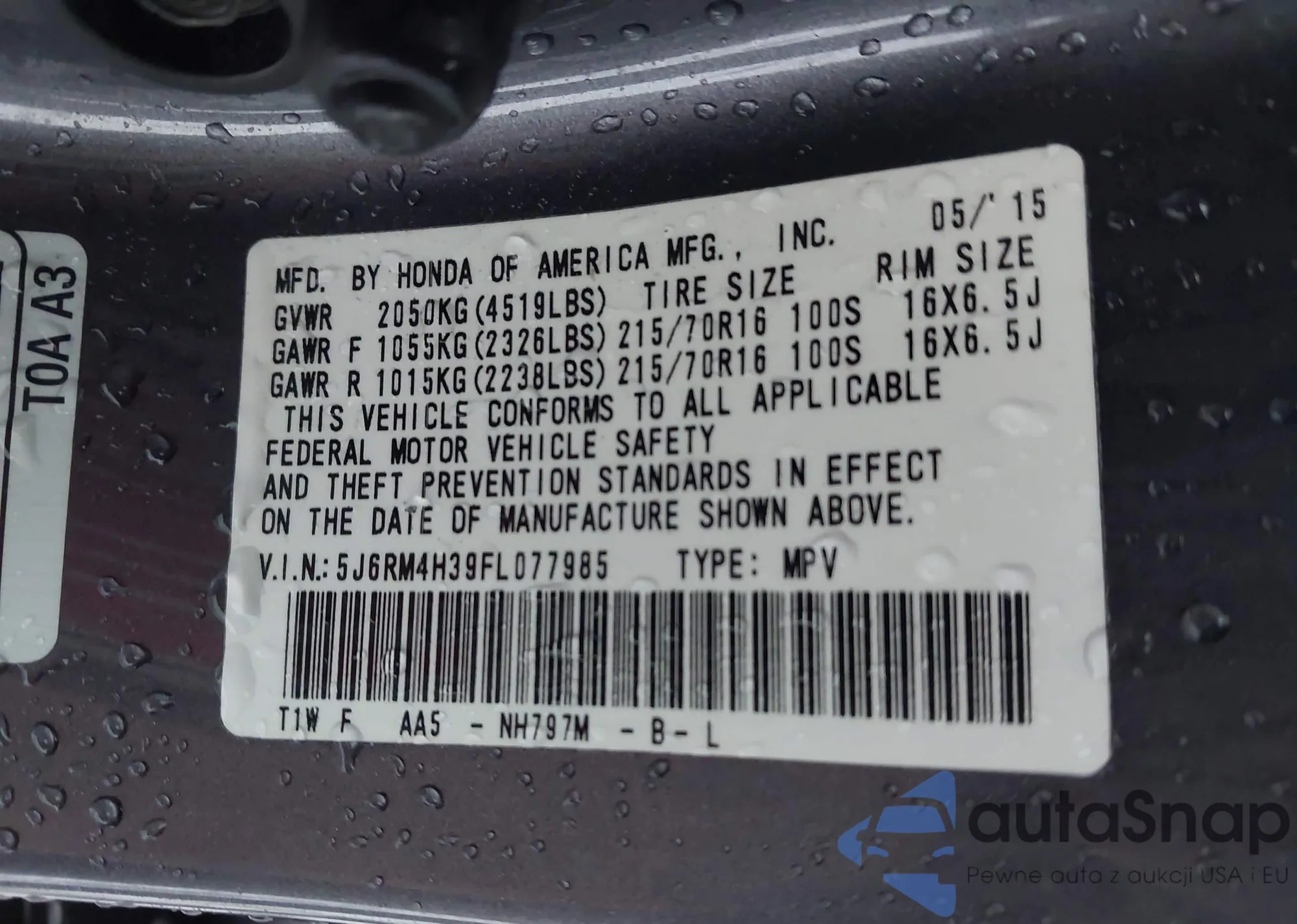 Samochód Honda CR-V 2015 (VIN 5J6RM4H39FL077985) nie był wcześniej licytowany. Dokumenty są czyste, przebieg odpowiada lub jest niższy niż średnia rynku. Sprzedaje go firma ubezpieczeniowa – polecamy zakup. Dostawa do portu zajmie ok. 6–8 tygodni.