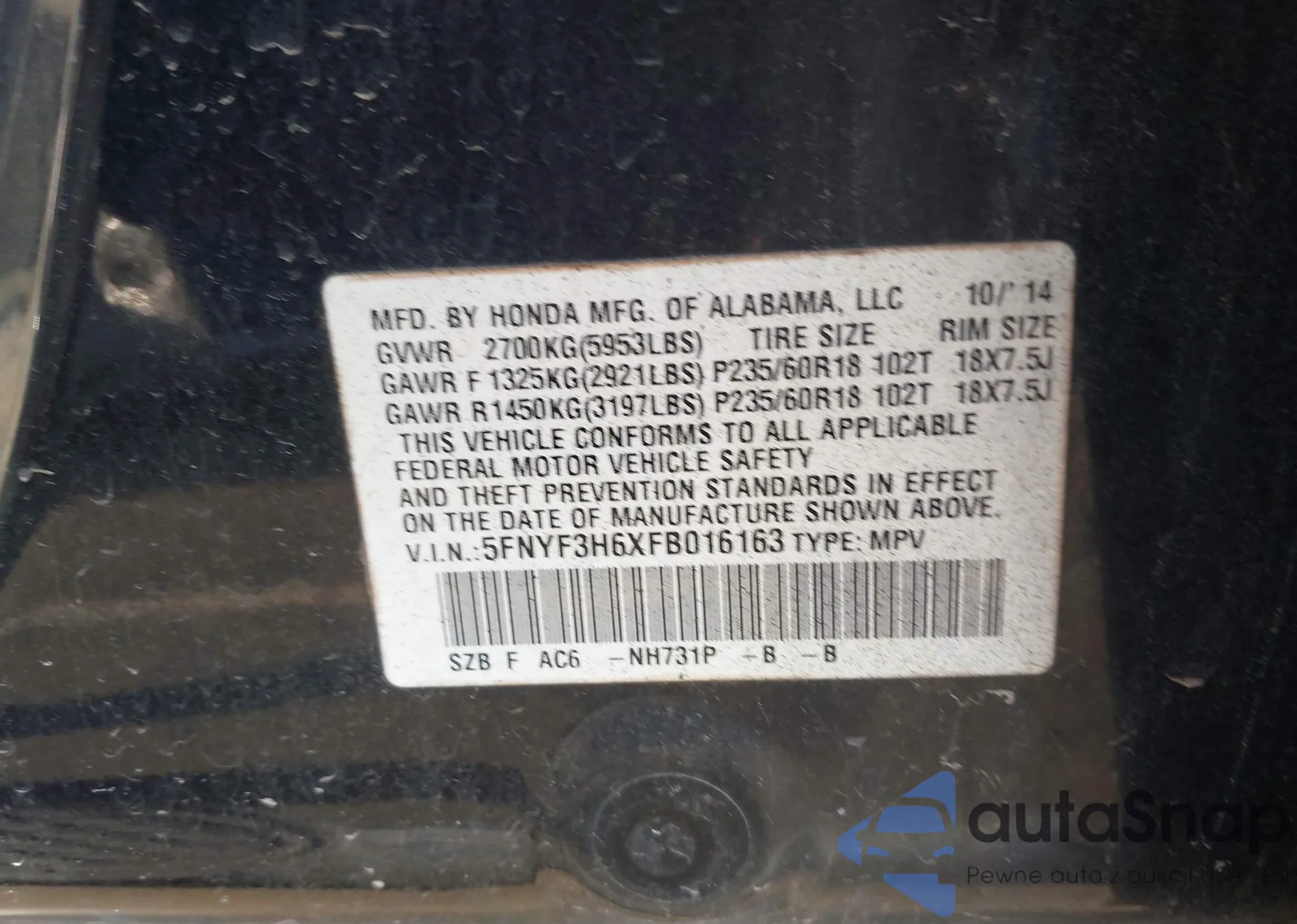 • VIN: 5FNYF3H6XFB016163