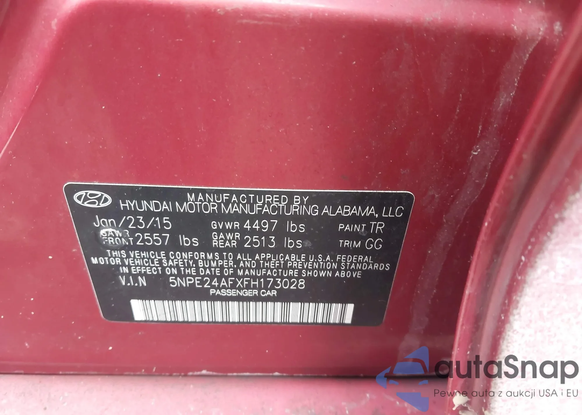 Samochód Hyundai Sonata 2015 (VIN 5NPE24AFXFH173028) nie był wcześniej licytowany. Dokumenty są czyste, przebieg odpowiada lub jest niższy niż średnia rynku. Sprzedaje go firma ubezpieczeniowa – polecamy zakup. Dostawa do portu zajmie ok. 6–8 tygodni.