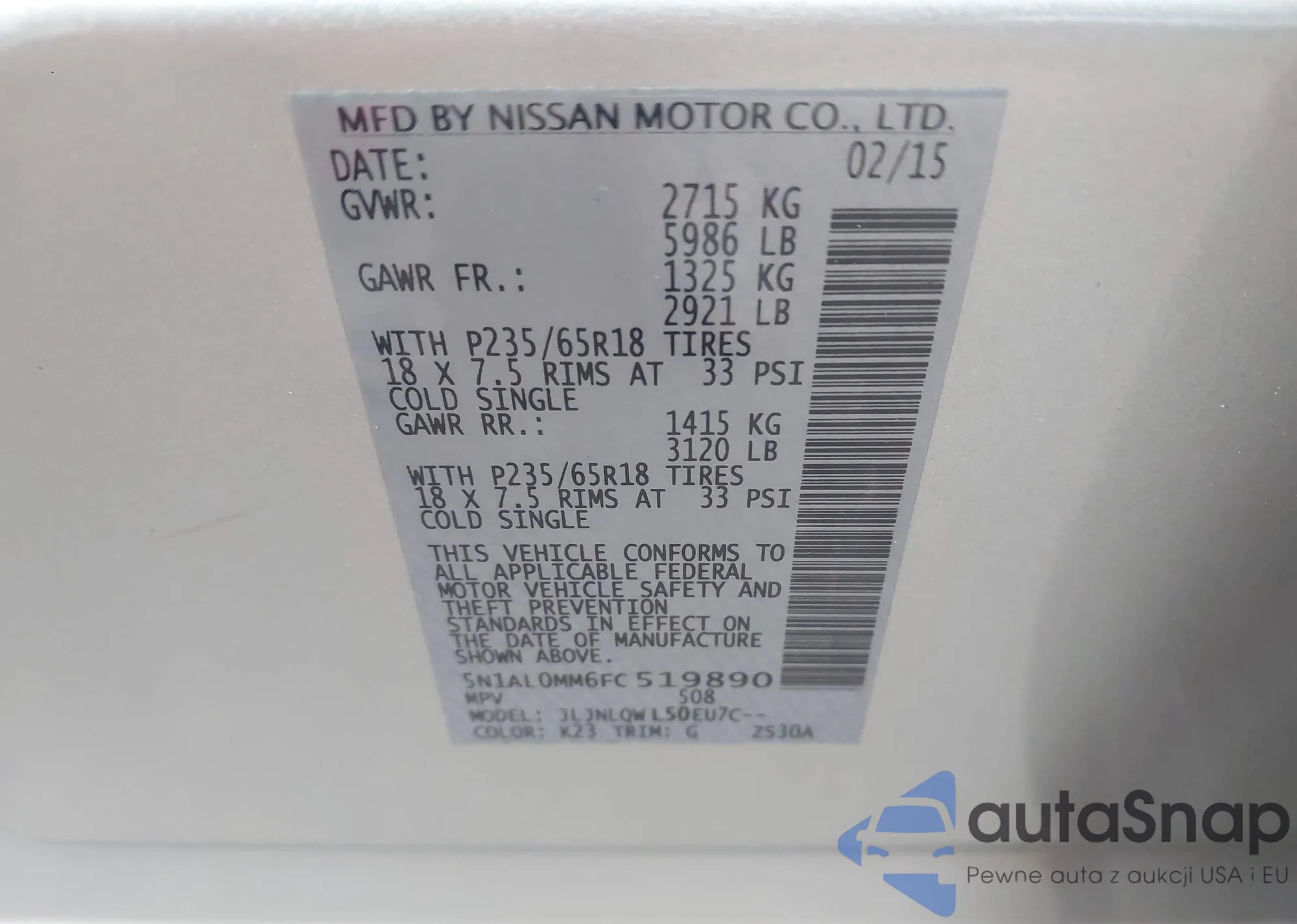 Samochód Infiniti QX60 2015 (VIN 5N1AL0MM6FC519890) nie był wcześniej licytowany. Dokumenty są czyste, przebieg odpowiada lub jest niższy niż średnia rynku. Sprzedaje go firma ubezpieczeniowa – polecamy zakup. Dostawa do portu zajmie ok. 6–8 tygodni.