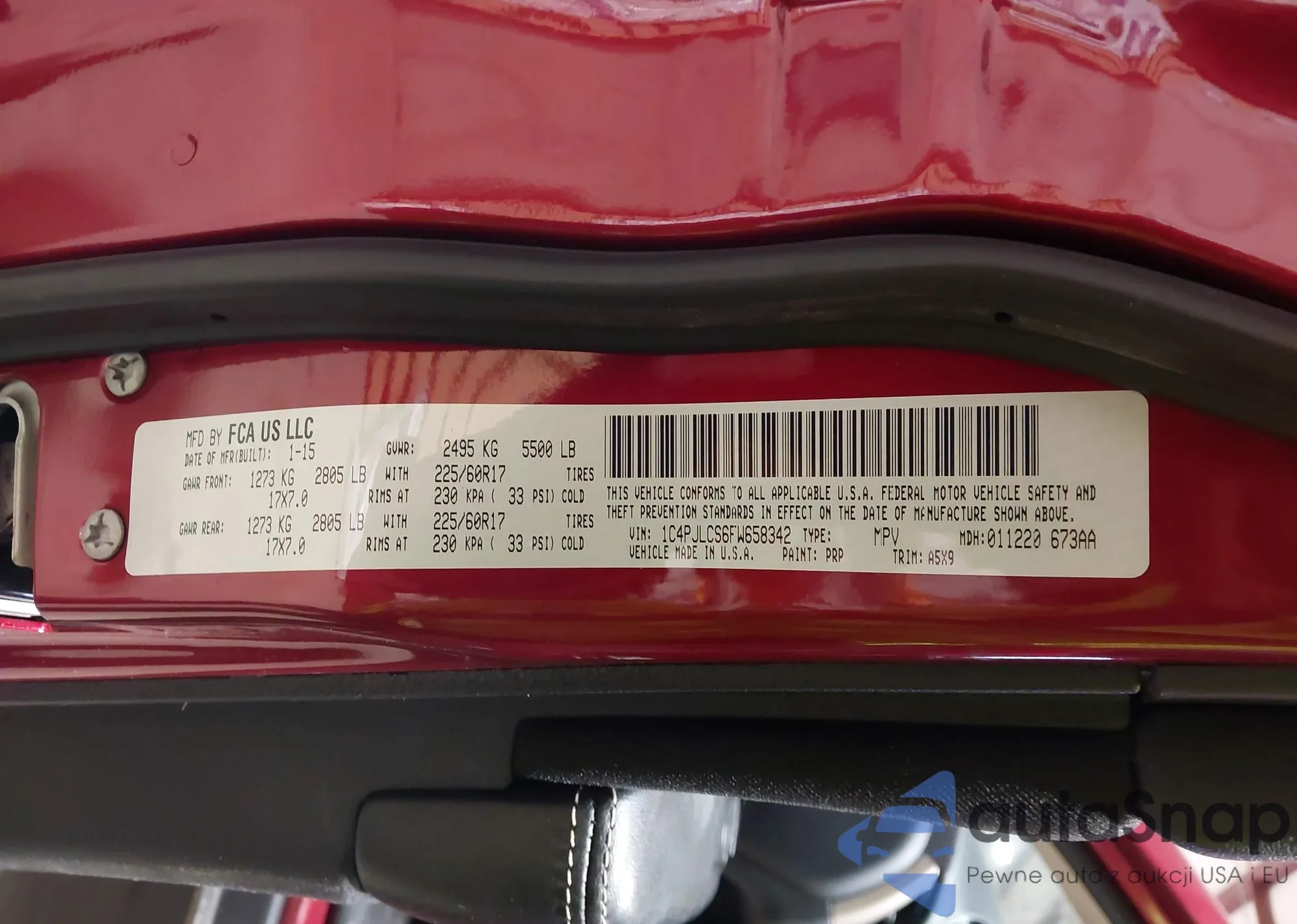 Samochód Jeep Cherokee 2015 (VIN 1C4PJLCS6FW658342) nie był wcześniej licytowany. Dokumenty są czyste, przebieg odpowiada lub jest niższy niż średnia rynku. Sprzedaje go firma ubezpieczeniowa – polecamy zakup. Dostawa do portu zajmie ok. 6–8 tygodni.