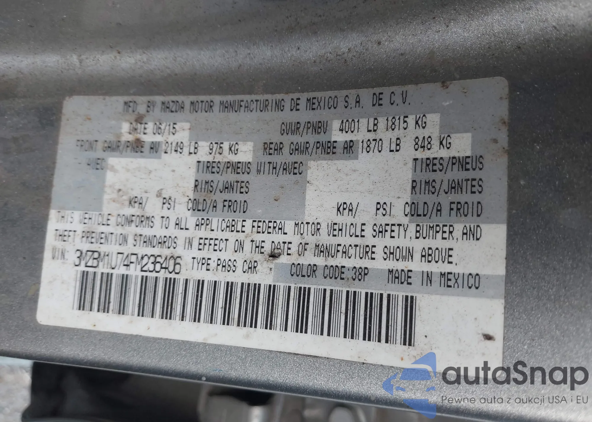 Samochód Mazda 3 2015 (VIN 3MZBM1U74FM236406) nie był wcześniej licytowany. Dokumenty są czyste, przebieg odpowiada lub jest niższy niż średnia rynku. Sprzedaje go firma ubezpieczeniowa – polecamy zakup. Dostawa do portu zajmie ok. 6–8 tygodni.
