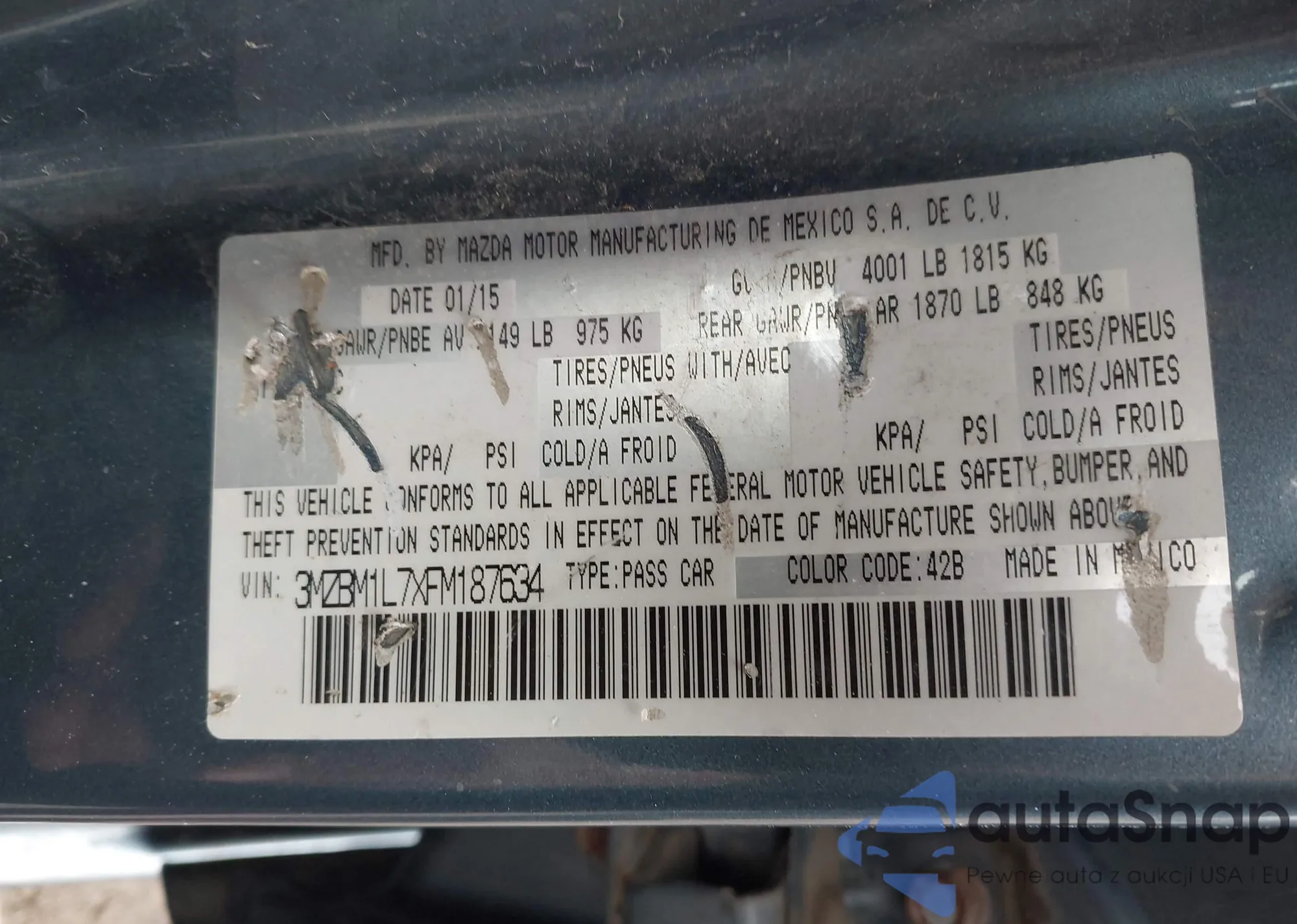 Samochód Mazda 3 2015 (VIN 3MZBM1L7XFM187634) sprzedaje go niezweryfikowany sprzedawca. Zalecamy raport Carfax i potwierdzenie możliwości rejestracji pojazdu przed zakupem.