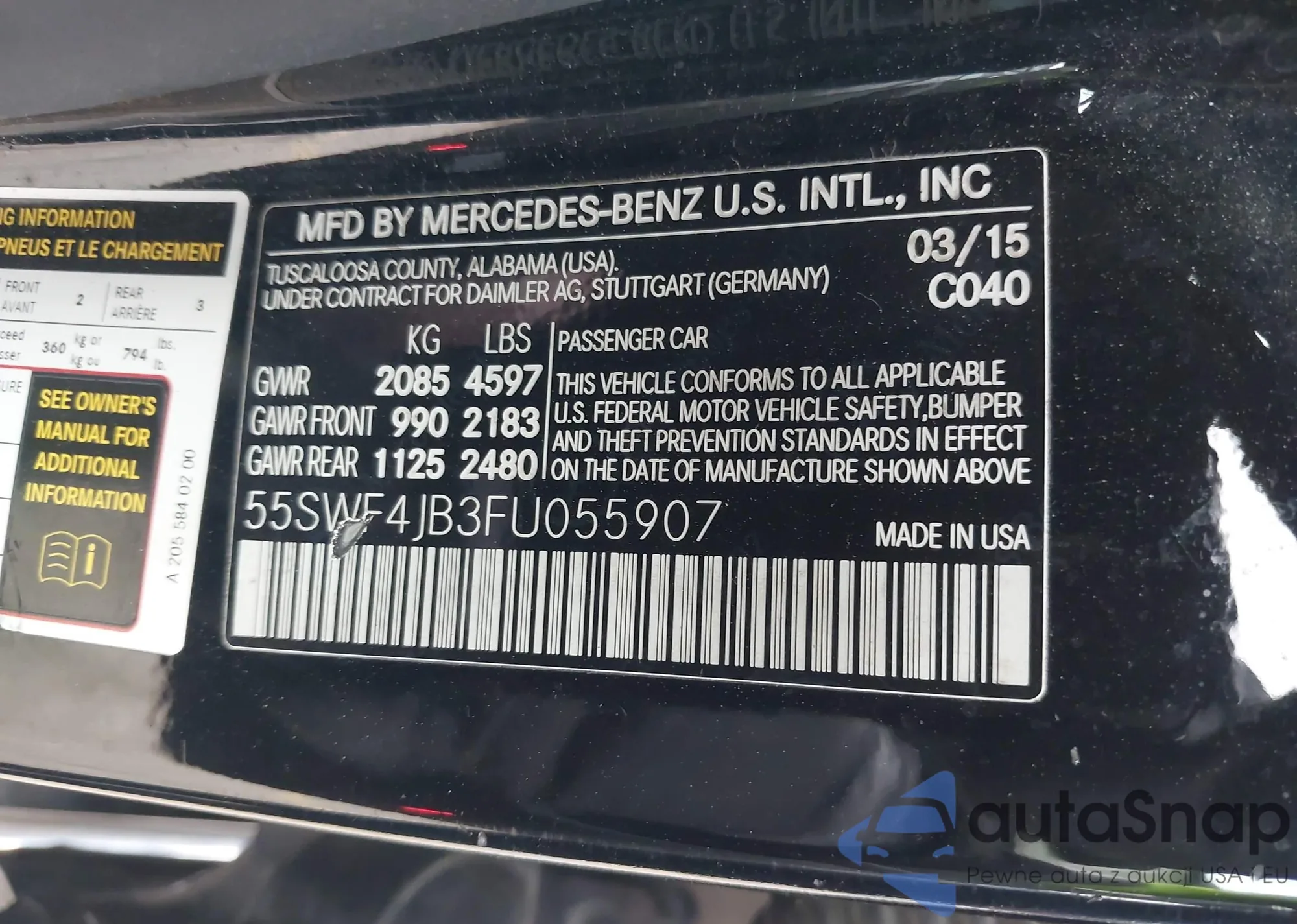 Samochód Mercedes-Benz C-klasse 2015 (VIN 55SWF4JB3FU055907) nie był wcześniej licytowany. Dokumenty są czyste, przebieg odpowiada lub jest niższy niż średnia rynku. Sprzedaje go firma ubezpieczeniowa – polecamy zakup. Dostawa do portu zajmie ok. 6–8 tygodni.
