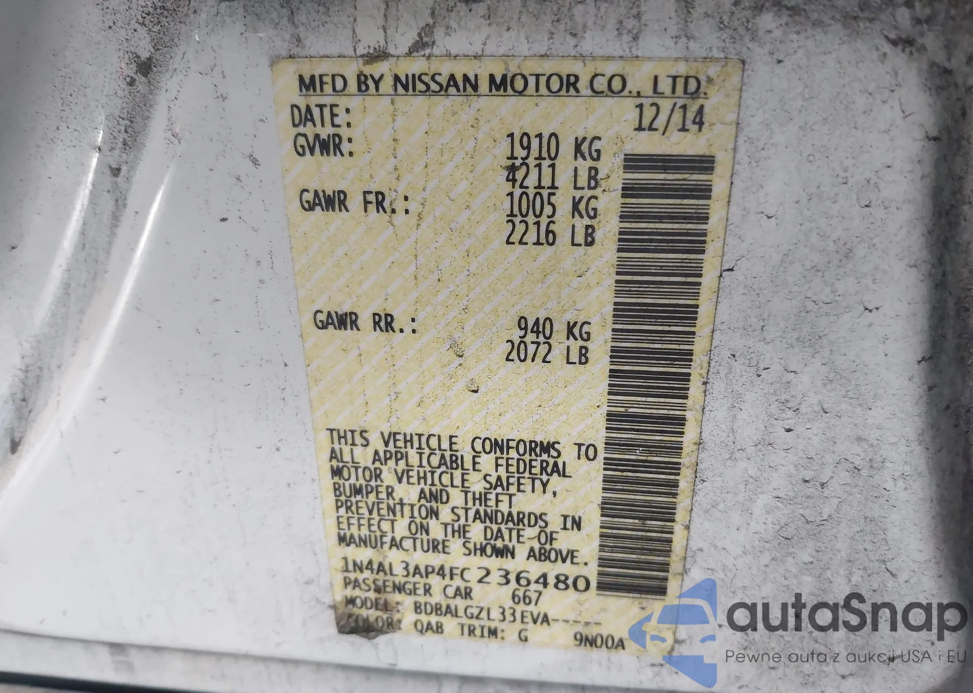Samochód Nissan Altima 2015 (VIN 1N4AL3AP4FC236480) ma dokumenty uniemożliwiające rejestrację. Mogą pojawić się trudności przy eksporcie i rejestracji. Skontaktuj się z ekspertami AutaSnap w celu znalezienia alternatywy.