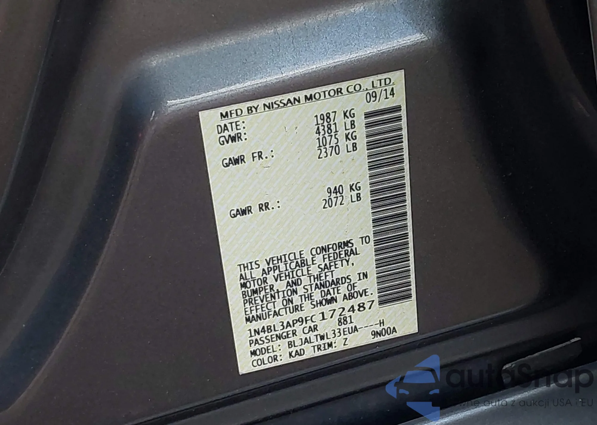 • VIN: 1N4BL3AP9FC172487