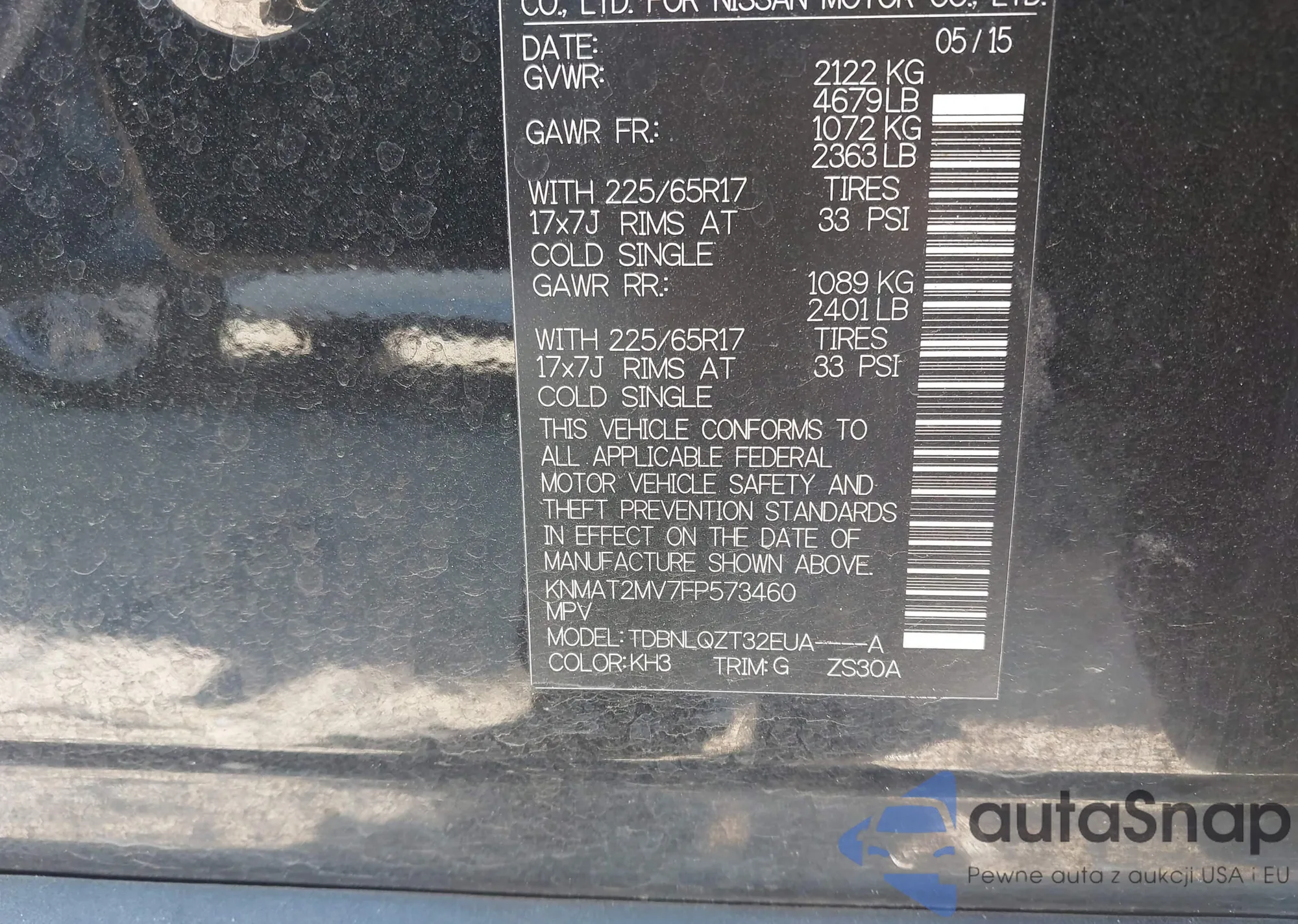 Samochód Nissan Rogue 2015 (VIN KNMAT2MV7FP573460) nie był wcześniej licytowany. Dokumenty są czyste, przebieg odpowiada lub jest niższy niż średnia rynku. Sprzedaje go firma ubezpieczeniowa – polecamy zakup. Dostawa do portu zajmie ok. 6–8 tygodni.