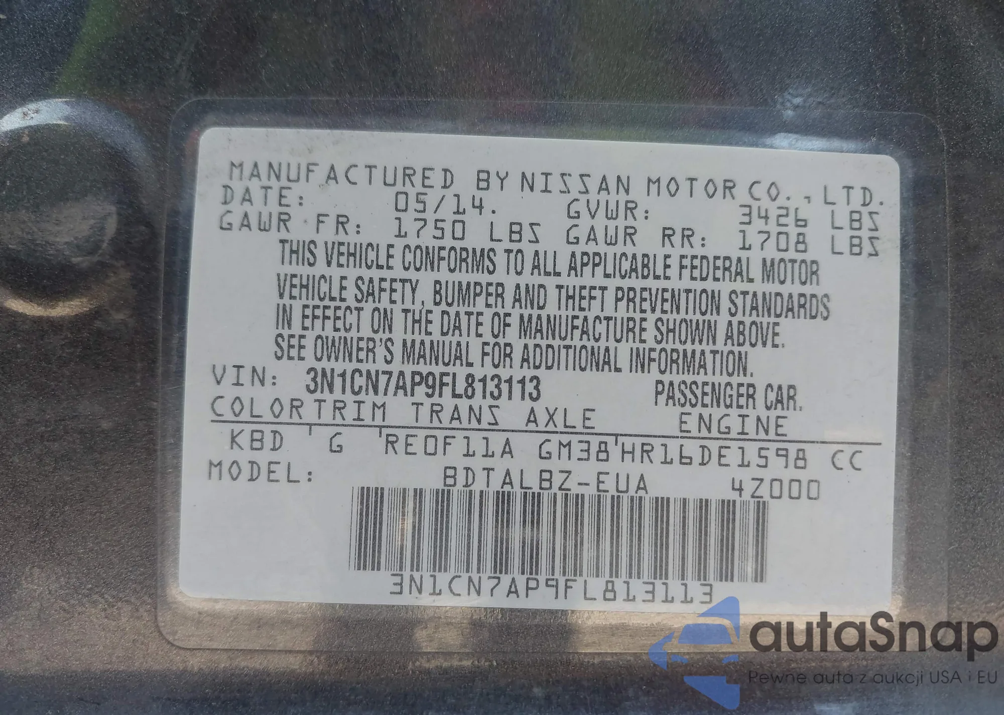 • VIN: 3N1CN7AP9FL813113