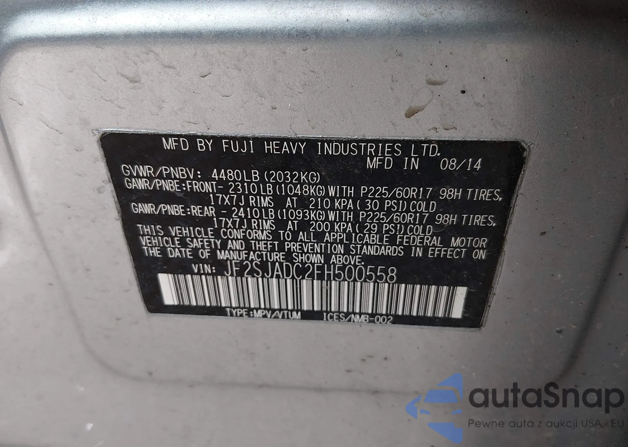 • VIN: JF2SJADC2FH500558