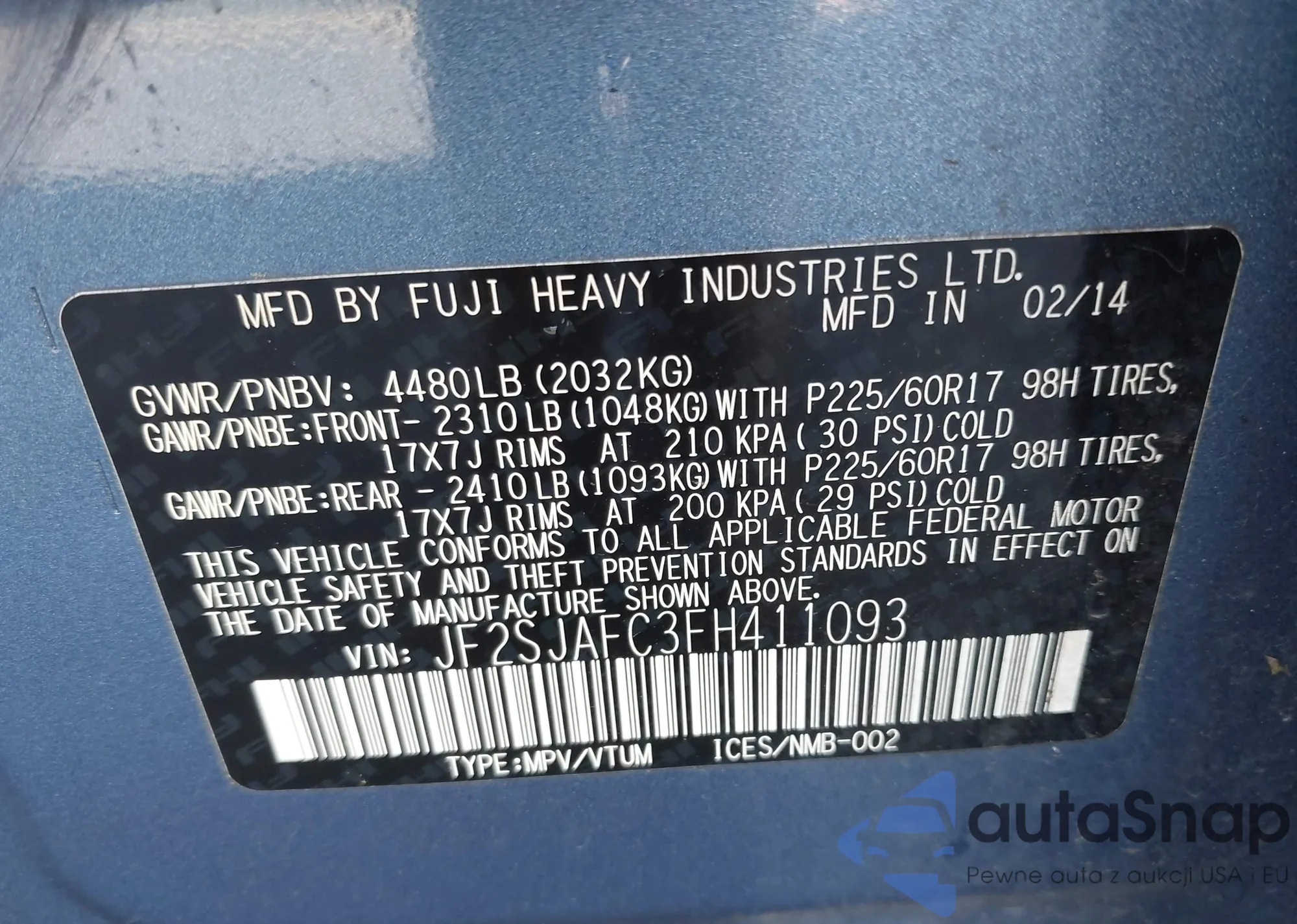 • VIN: JF2SJAFC3FH411093