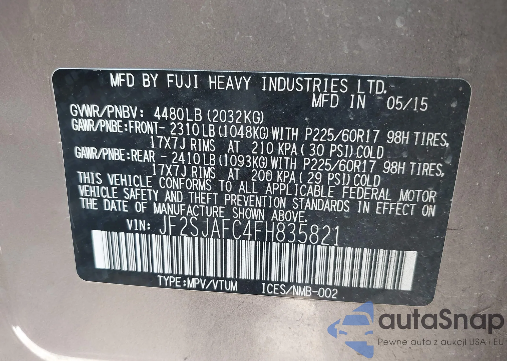 • VIN: JF2SJAFC4FH835821