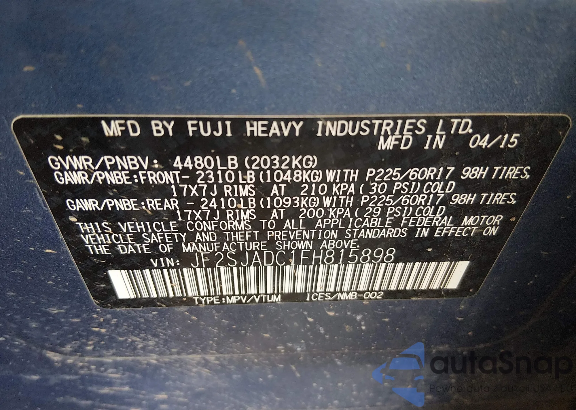 • VIN: JF2SJADC1FH815898