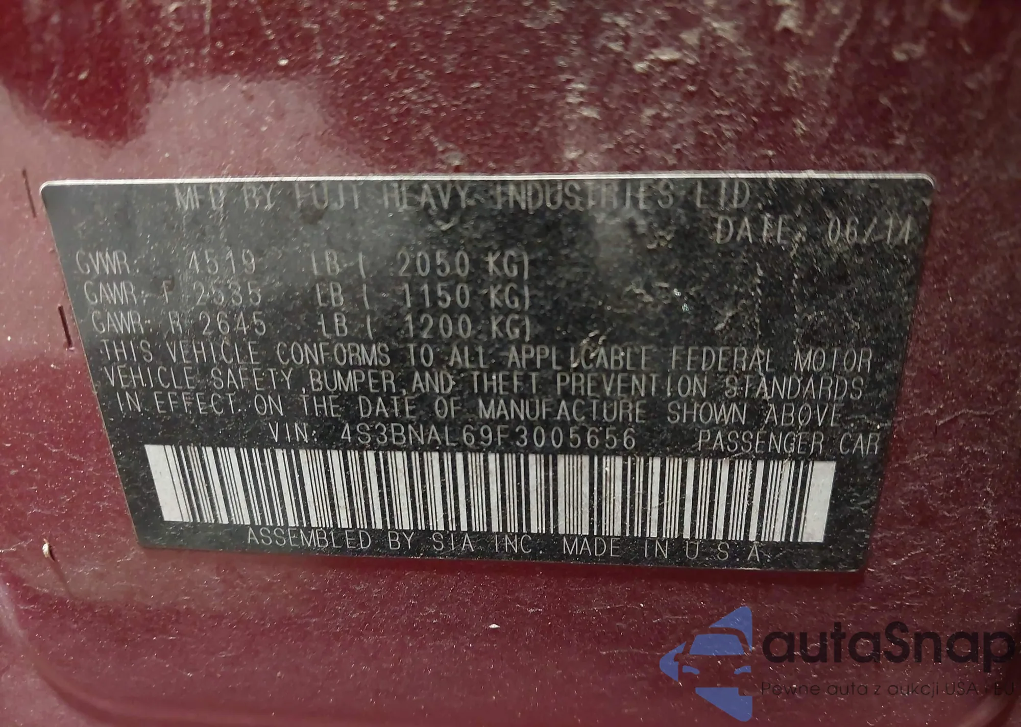 Samochód Subaru Legacy 2015 (VIN 4S3BNAL69F3005656) nie był wcześniej licytowany. Dokumenty są czyste, przebieg odpowiada lub jest niższy niż średnia rynku. Sprzedaje go firma ubezpieczeniowa – polecamy zakup. Dostawa do portu zajmie ok. 6–8 tygodni.