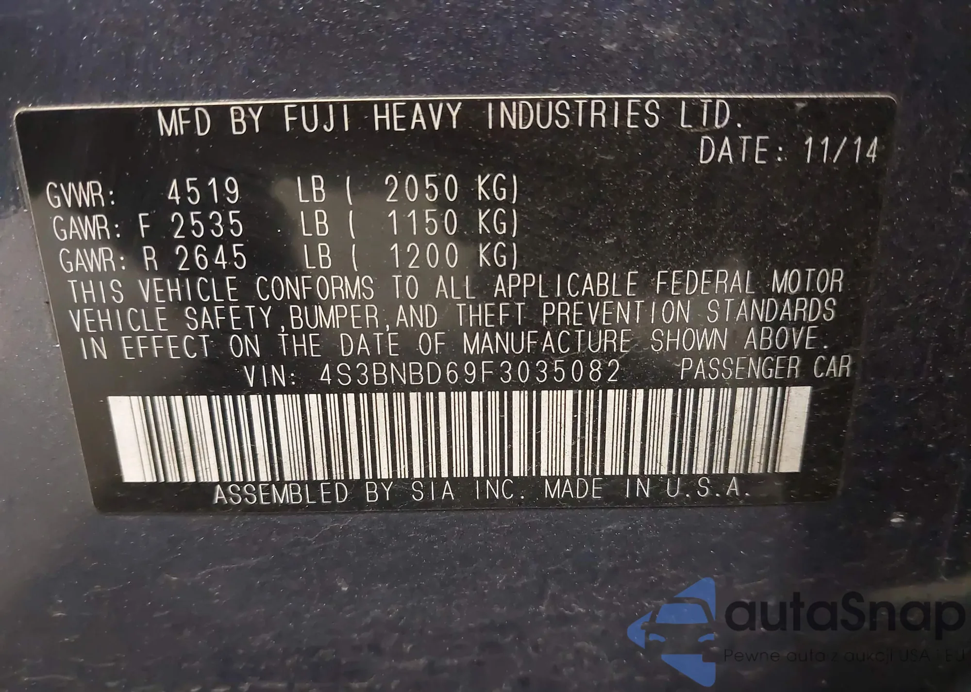 Samochód Subaru Legacy 2015 (VIN 4S3BNBD69F3035082) sprzedaje go niezweryfikowany sprzedawca. Zalecamy raport Carfax i potwierdzenie możliwości rejestracji pojazdu przed zakupem.
