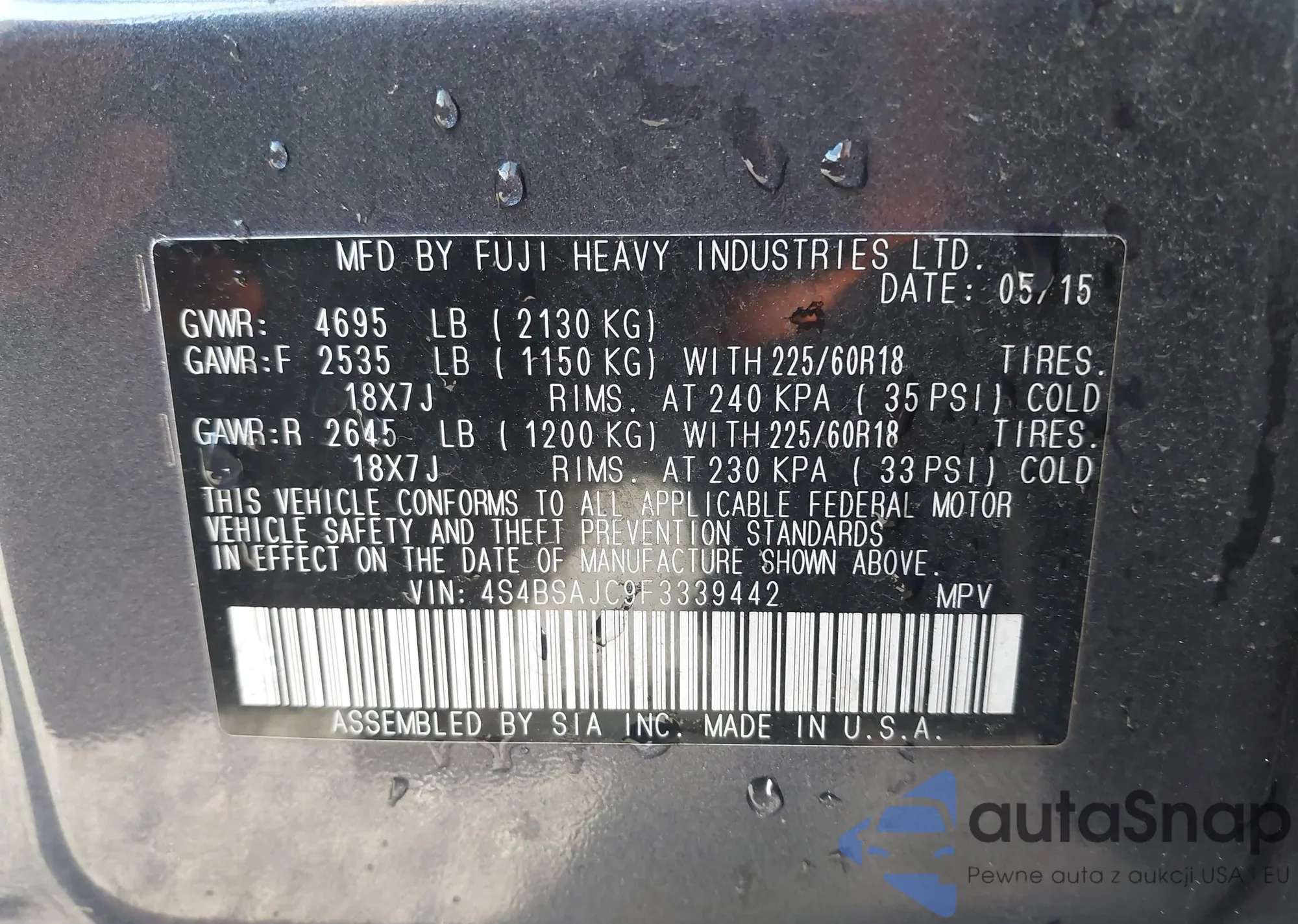 Samochód Subaru Outback 2015 (VIN 4S4BSAJC9F3339442) nie był wcześniej licytowany. Dokumenty są czyste, przebieg odpowiada lub jest niższy niż średnia rynku. Sprzedaje go firma ubezpieczeniowa – polecamy zakup. Dostawa do portu zajmie ok. 6–8 tygodni.