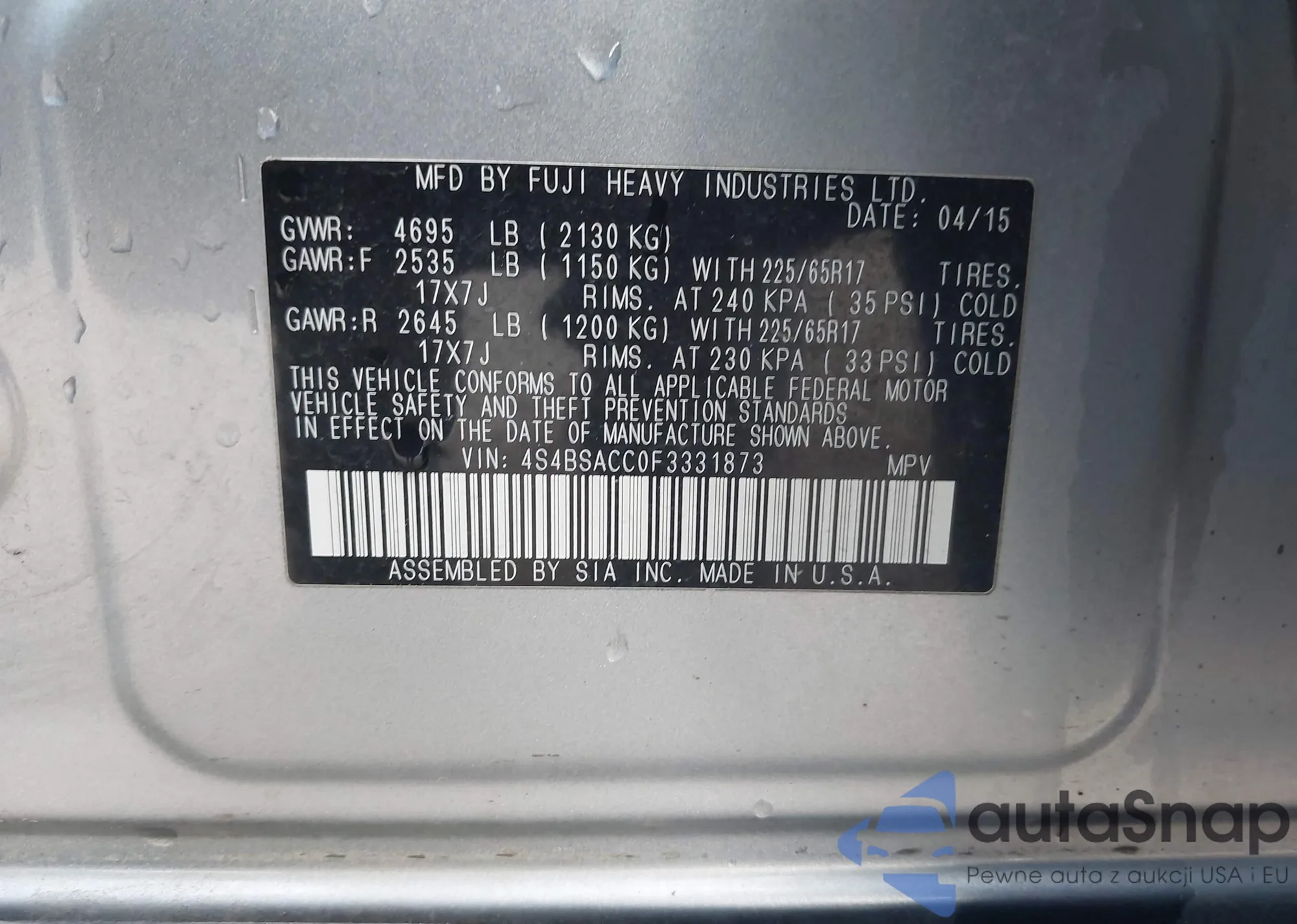 Samochód Subaru Outback 2015 (VIN 4S4BSACC0F3331873) nie był wcześniej licytowany. Dokumenty są czyste, przebieg odpowiada lub jest niższy niż średnia rynku. Sprzedaje go firma ubezpieczeniowa – polecamy zakup. Dostawa do portu zajmie ok. 6–8 tygodni.