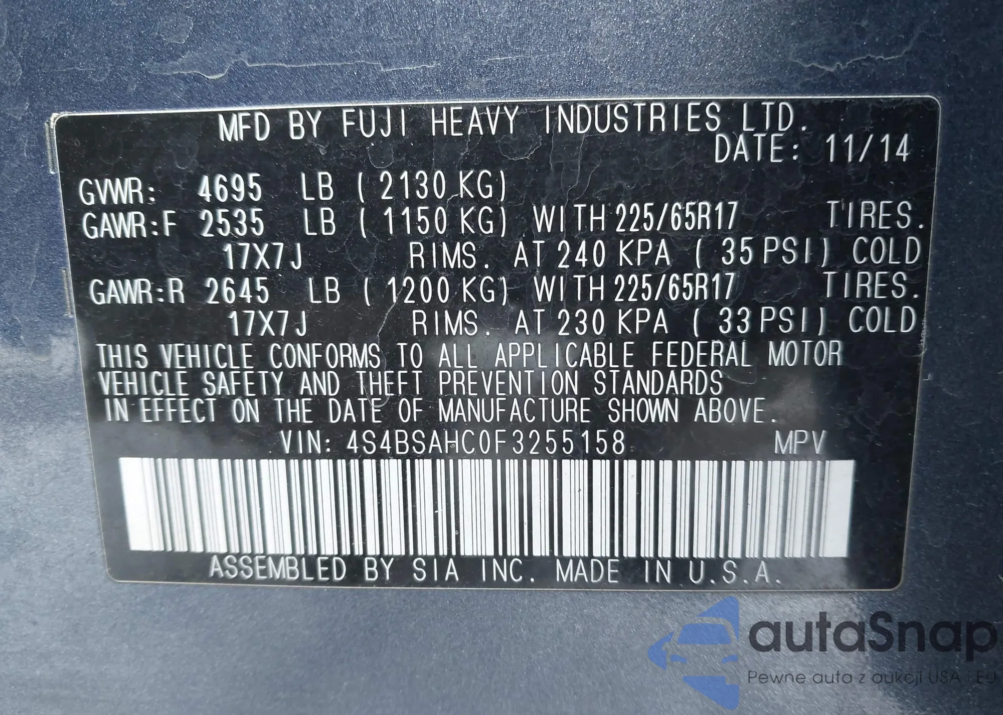 • VIN: 4S4BSAHC0F3255158