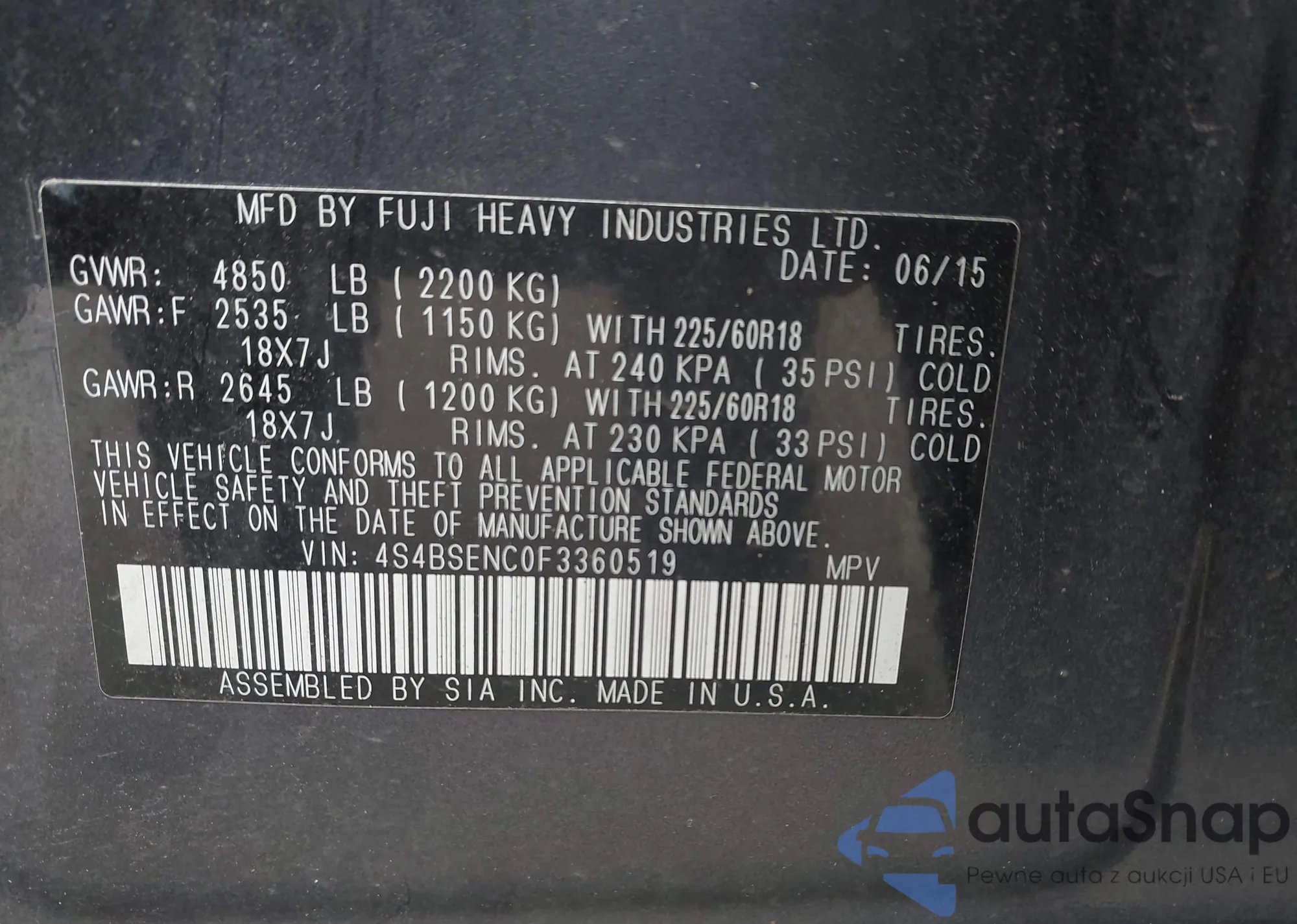 Samochód Subaru Outback 2015 (VIN 4S4BSENC0F3360519) nie był wcześniej licytowany. Dokumenty są czyste, przebieg odpowiada lub jest niższy niż średnia rynku. Sprzedaje go firma ubezpieczeniowa – polecamy zakup. Dostawa do portu zajmie ok. 6–8 tygodni.