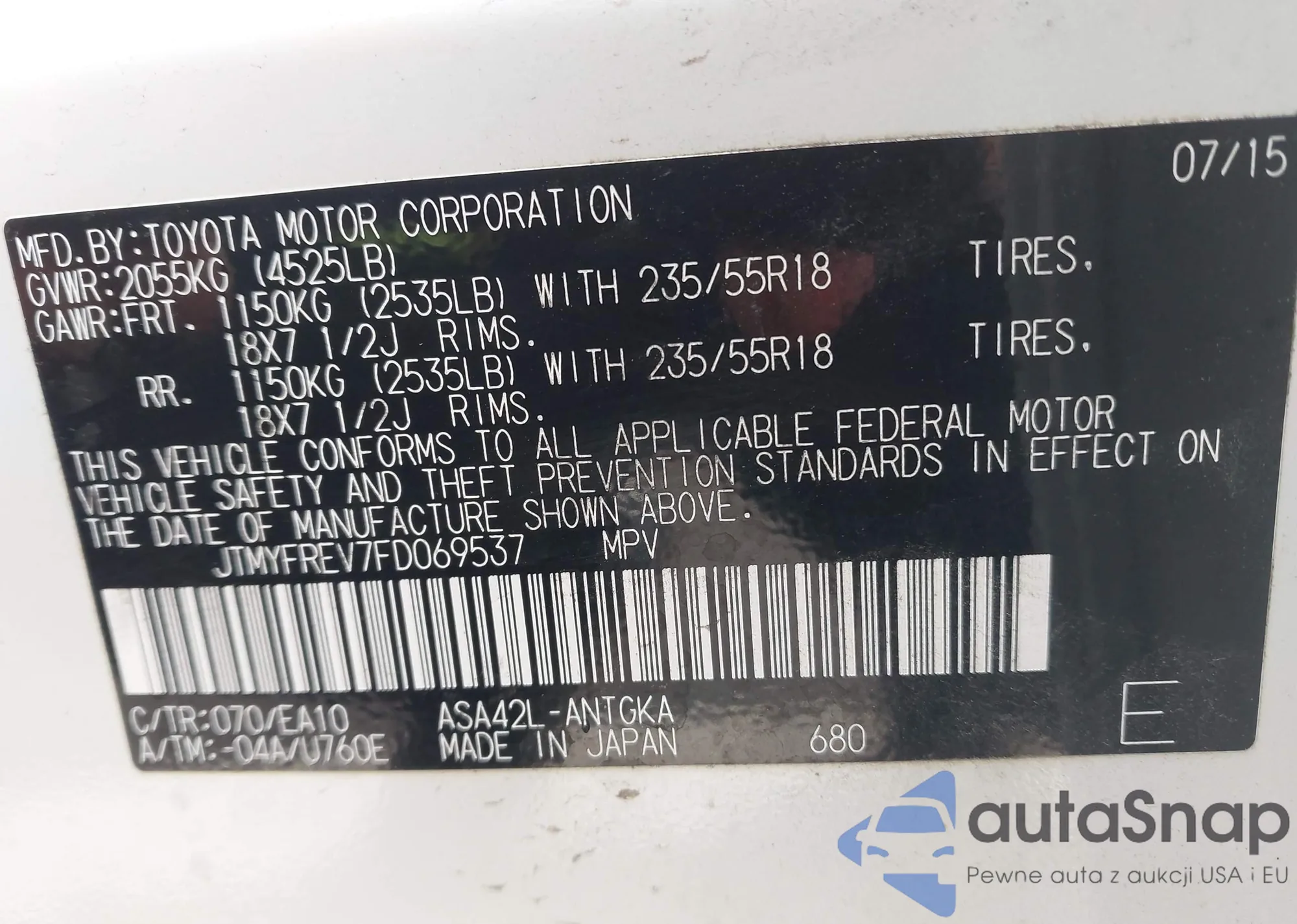 • VIN: JTMYFREV7FD069537