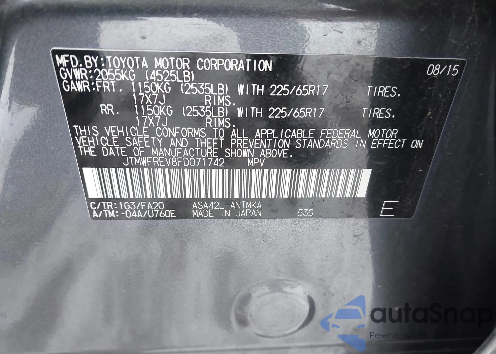 Samochód Toyota RAV 4 2015 (VIN JTMWFREV8FD071742) nie był wcześniej licytowany. Dokumenty są czyste, przebieg odpowiada lub jest niższy niż średnia rynku. Sprzedaje go firma ubezpieczeniowa – polecamy zakup. Dostawa do portu zajmie ok. 6–8 tygodni.