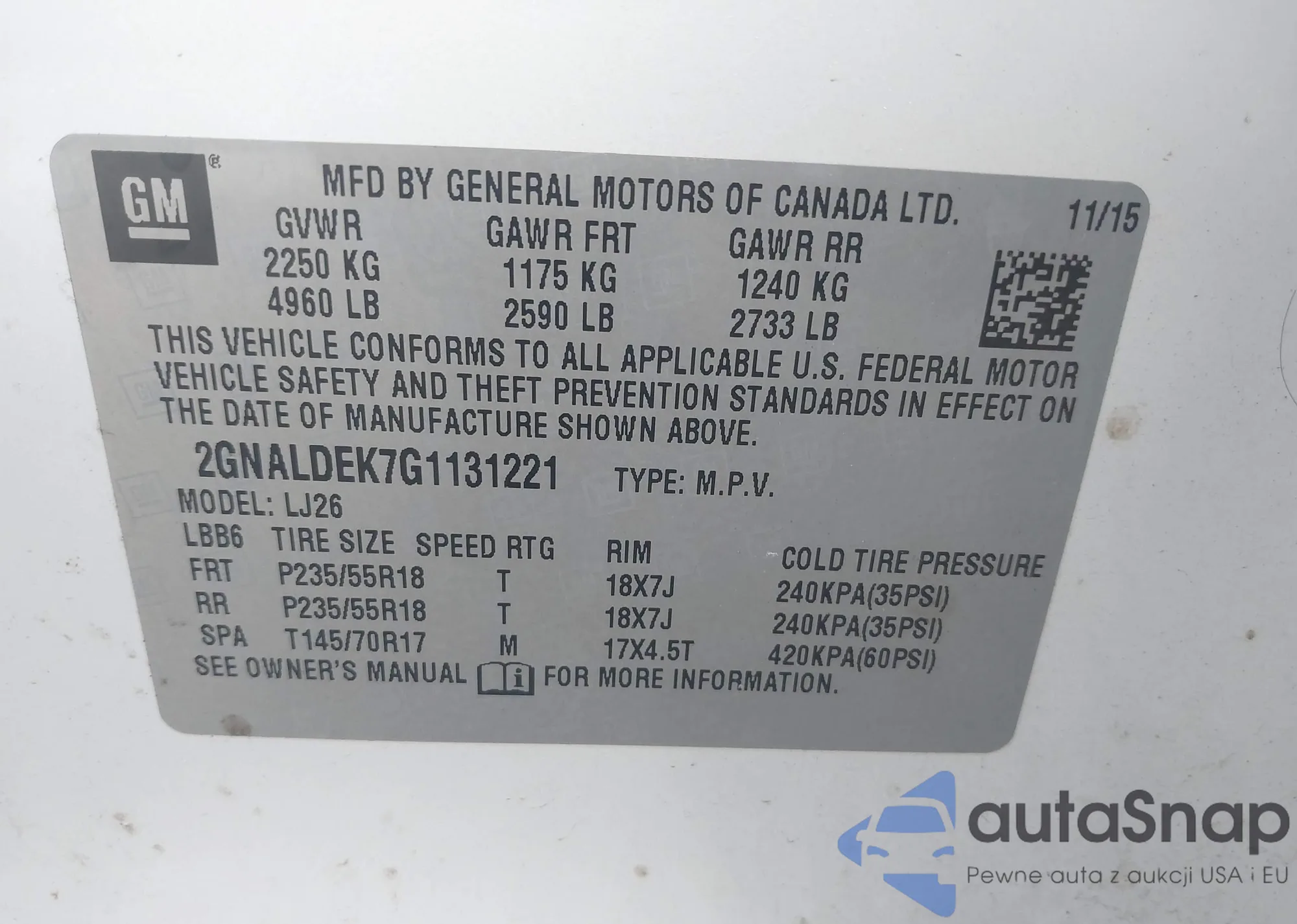 Samochód Chevrolet Equinox 2016 (VIN 2GNALDEK7G1131221) nie był wcześniej licytowany. Dokumenty są czyste, przebieg odpowiada lub jest niższy niż średnia rynku. Sprzedaje go firma ubezpieczeniowa – polecamy zakup. Dostawa do portu zajmie ok. 6–8 tygodni.