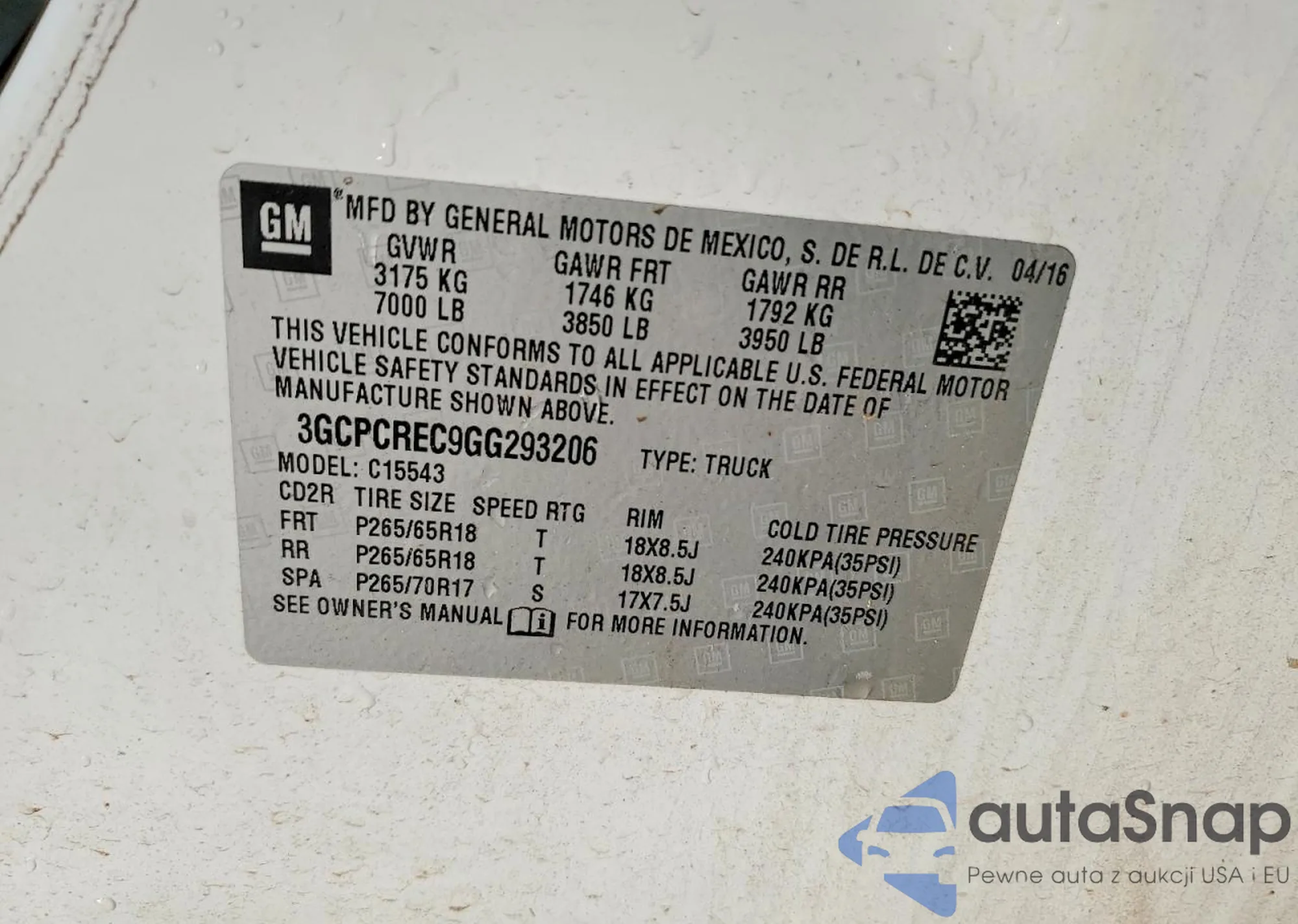 VIN: 3GCPCREC9GG293206