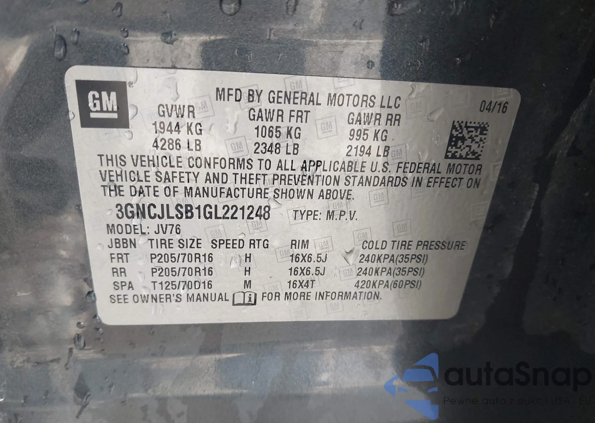 Samochód Chevrolet Trax 2016 (VIN 3GNCJLSB1GL221248) nie był wcześniej licytowany. Dokumenty są czyste, przebieg odpowiada lub jest niższy niż średnia rynku. Sprzedaje go firma ubezpieczeniowa – polecamy zakup. Dostawa do portu zajmie ok. 6–8 tygodni.