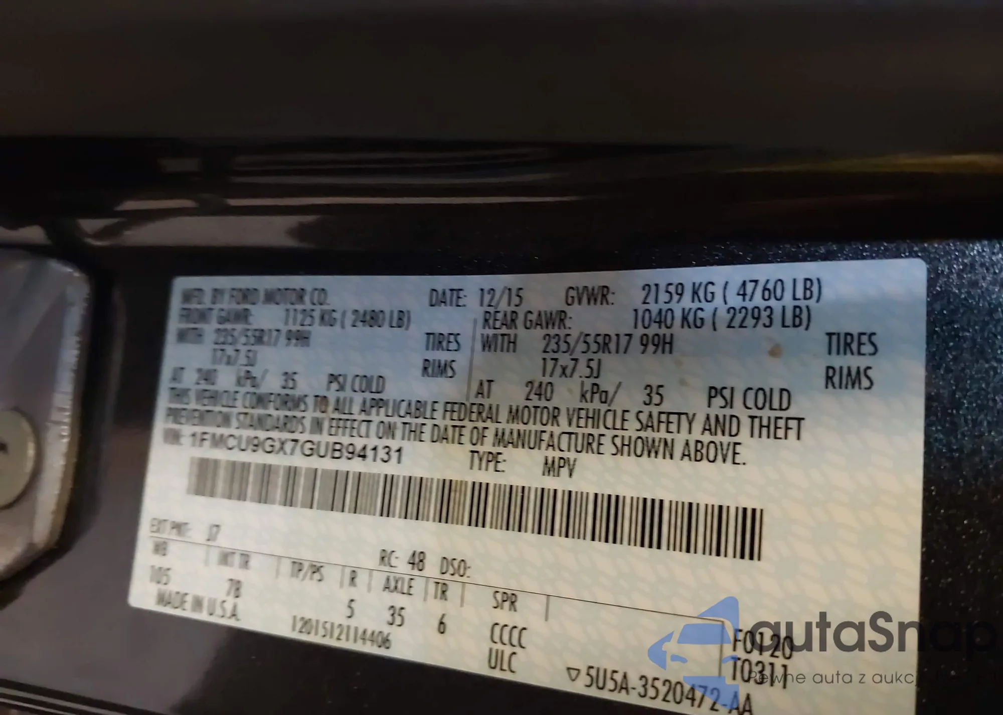 Samochód Ford Escape 2016 (VIN 1FMCU9GX7GUB94131) nie był wcześniej licytowany. Dokumenty są czyste, przebieg odpowiada lub jest niższy niż średnia rynku. Sprzedaje go firma ubezpieczeniowa – polecamy zakup. Dostawa do portu zajmie ok. 6–8 tygodni.