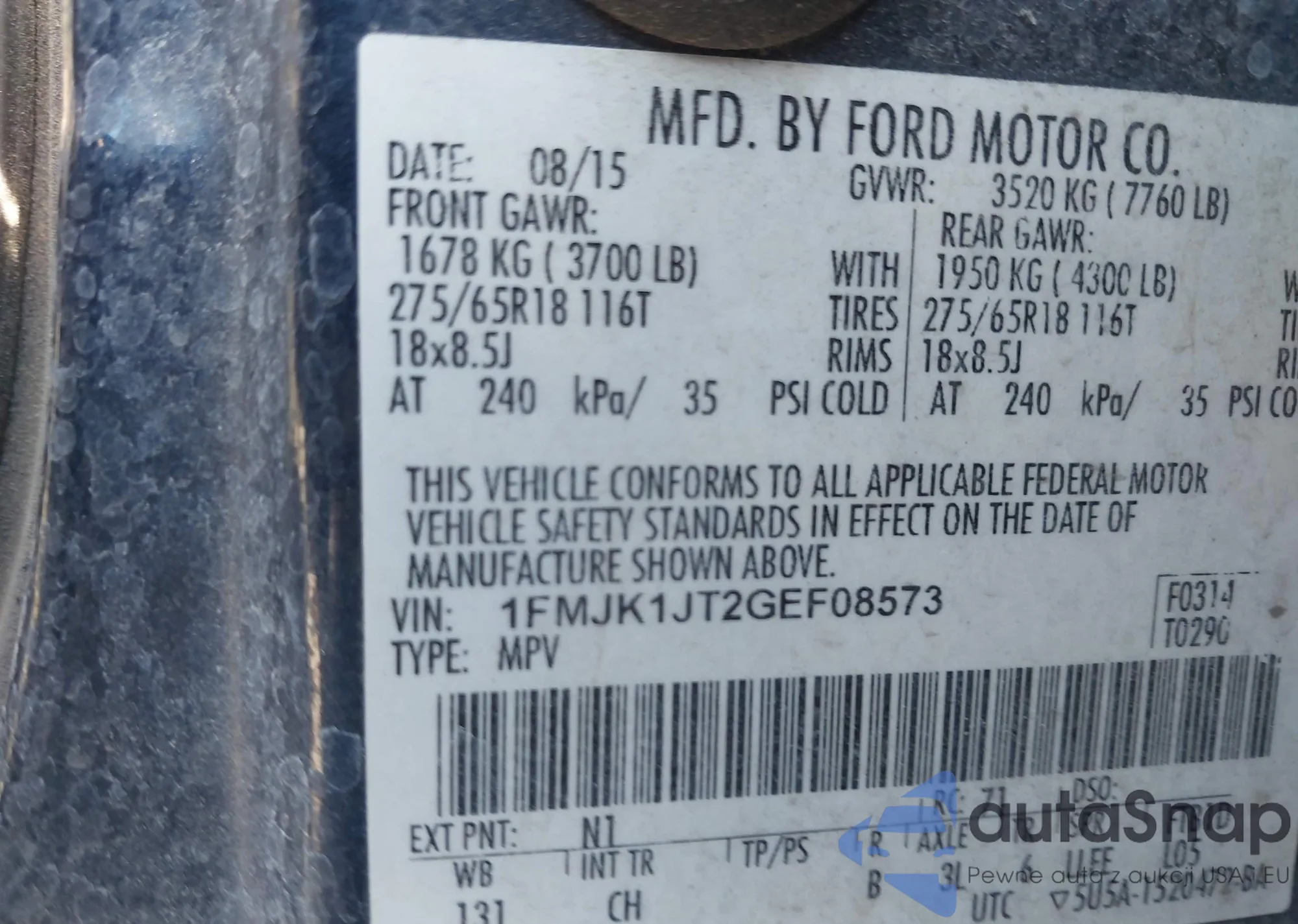 Samochód Ford Expedition 2016 (VIN 1FMJK1JT2GEF08573) nie był wcześniej licytowany. Dokumenty są czyste, przebieg odpowiada lub jest niższy niż średnia rynku. Sprzedaje go firma ubezpieczeniowa – polecamy zakup. Dostawa do portu zajmie ok. 6–8 tygodni.