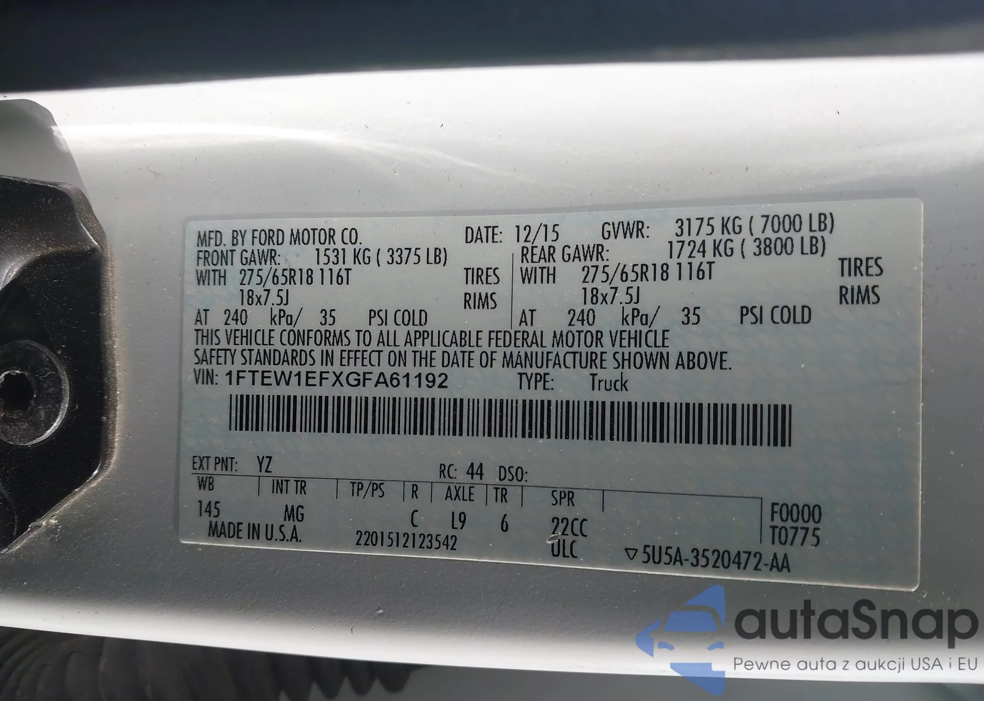 Samochód Ford F-150 2016 (VIN 1FTEW1EFXGFA61192) nie był wcześniej licytowany. Dokumenty są czyste, przebieg odpowiada lub jest niższy niż średnia rynku. Sprzedaje go firma ubezpieczeniowa – polecamy zakup. Dostawa do portu zajmie ok. 6–8 tygodni.