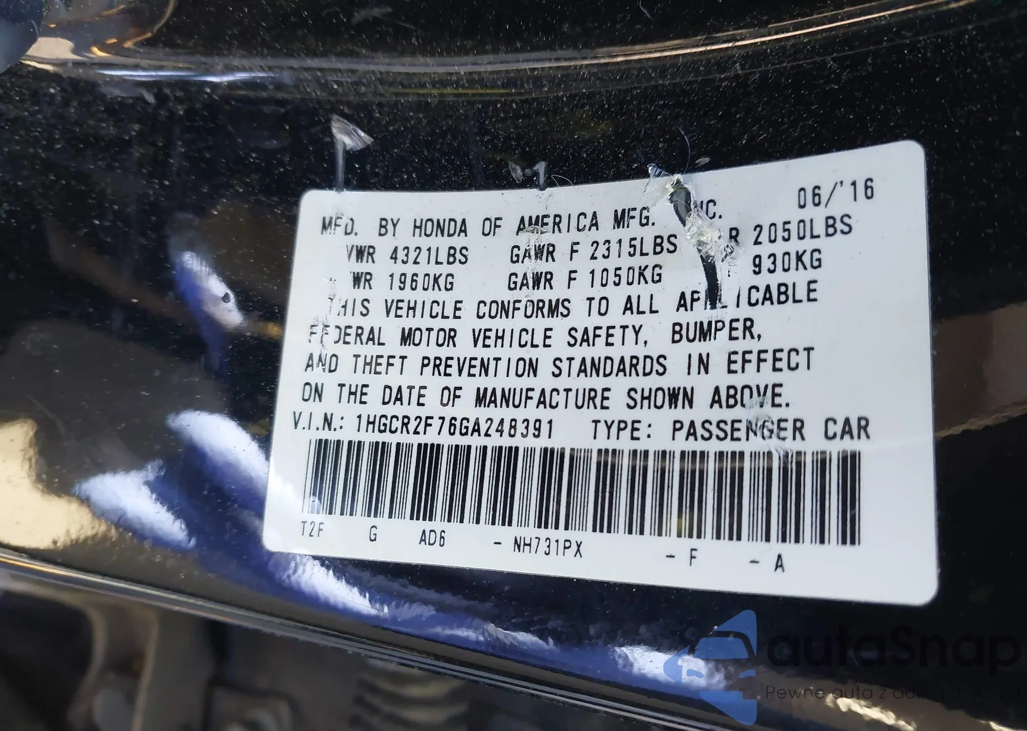 • VIN: 1HGCR2F76GA248391