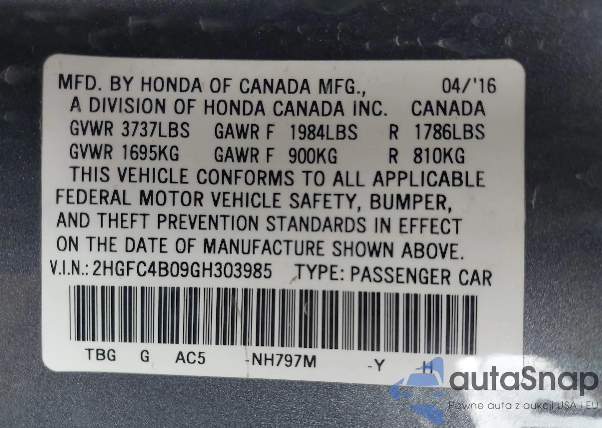 Samochód Honda Civic 2016 (VIN 2HGFC4B09GH303985) nie był wcześniej licytowany. Dokumenty są czyste, przebieg odpowiada lub jest niższy niż średnia rynku. Sprzedaje go firma ubezpieczeniowa – polecamy zakup. Dostawa do portu zajmie ok. 6–8 tygodni.