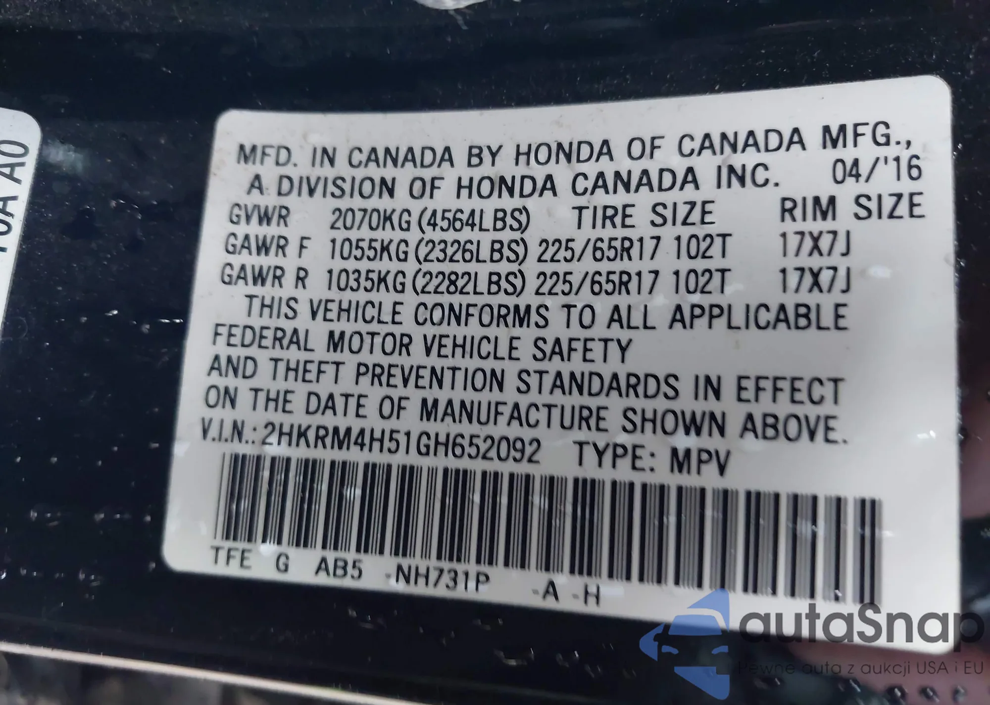 VIN: 2HKRM4H51GH652092