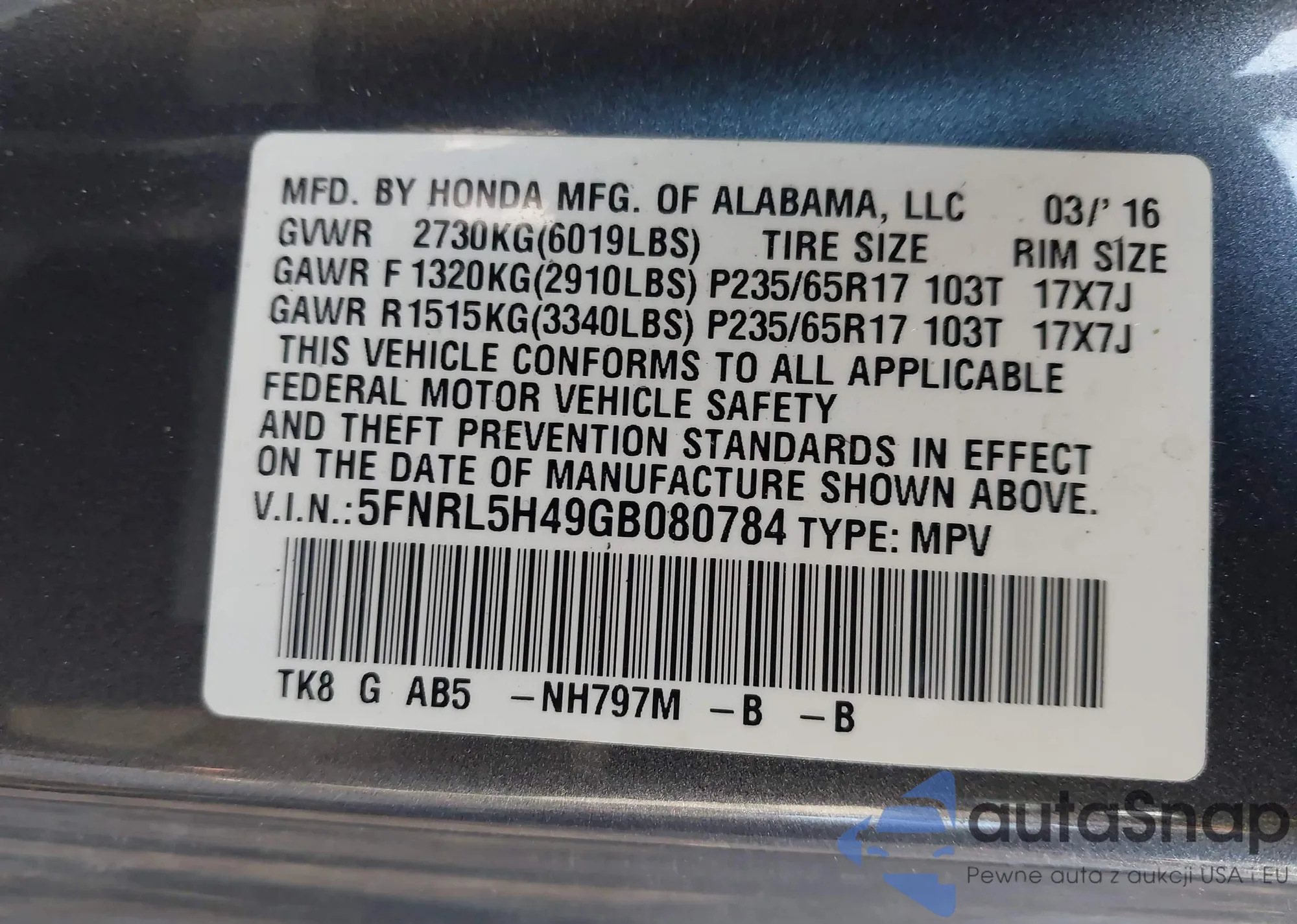 Samochód Honda Odyssey 2016 (VIN 5FNRL5H49GB080784) nie był wcześniej licytowany. Dokumenty są czyste, przebieg odpowiada lub jest niższy niż średnia rynku. Sprzedaje go firma ubezpieczeniowa – polecamy zakup. Dostawa do portu zajmie ok. 6–8 tygodni.