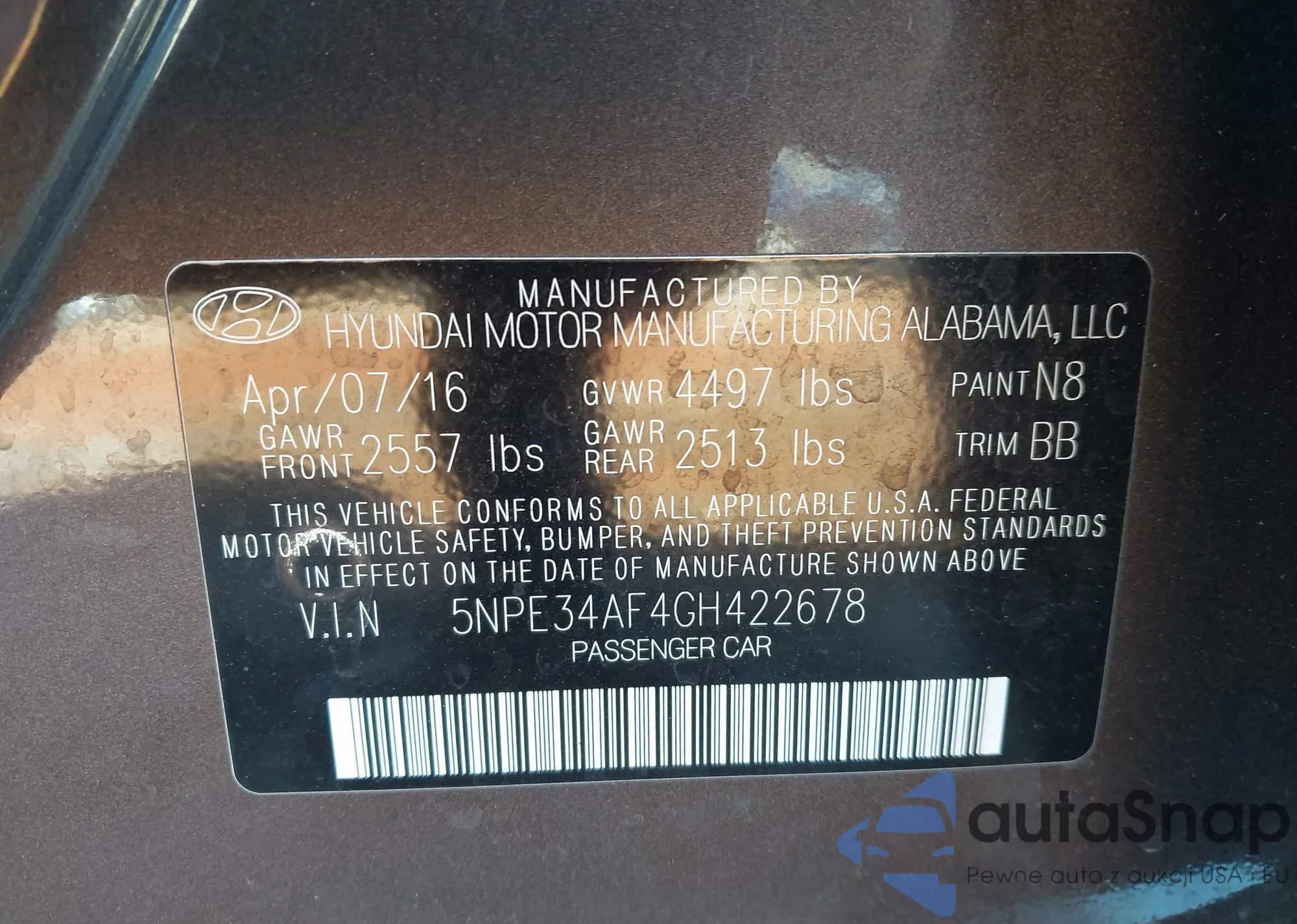 Samochód Hyundai Sonata 2016 (VIN 5NPE34AF4GH422678) nie był wcześniej licytowany. Dokumenty są czyste, przebieg odpowiada lub jest niższy niż średnia rynku. Sprzedaje go firma ubezpieczeniowa – polecamy zakup. Dostawa do portu zajmie ok. 6–8 tygodni.