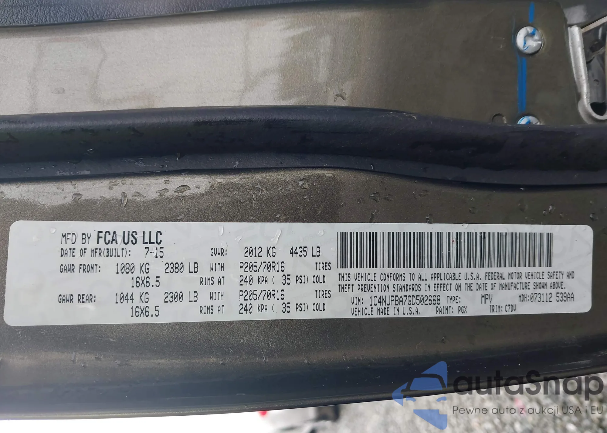 Samochód Jeep Liberty (Patriot) 2016 (VIN 1C4NJPBA7GD502668) ma dokumenty uniemożliwiające rejestrację. Mogą pojawić się trudności przy eksporcie i rejestracji. Skontaktuj się z ekspertami AutaSnap w celu znalezienia alternatywy.