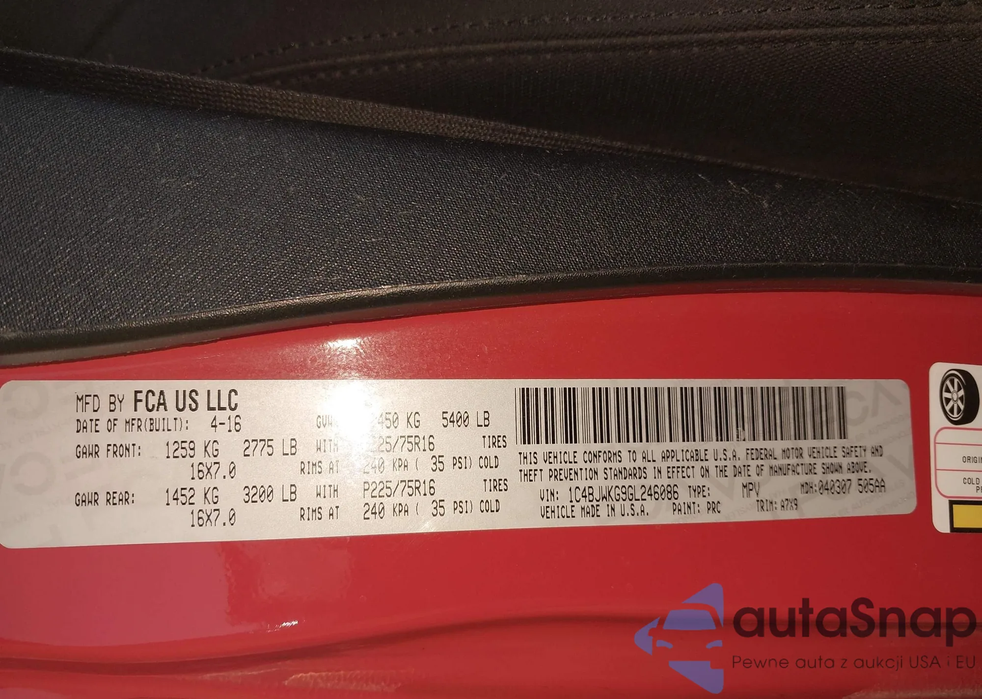Samochód Jeep Wrangler 2016 (VIN 1C4BJWKG9GL246086) sprzedaje go niezweryfikowany sprzedawca. Zalecamy raport Carfax i potwierdzenie możliwości rejestracji pojazdu przed zakupem.