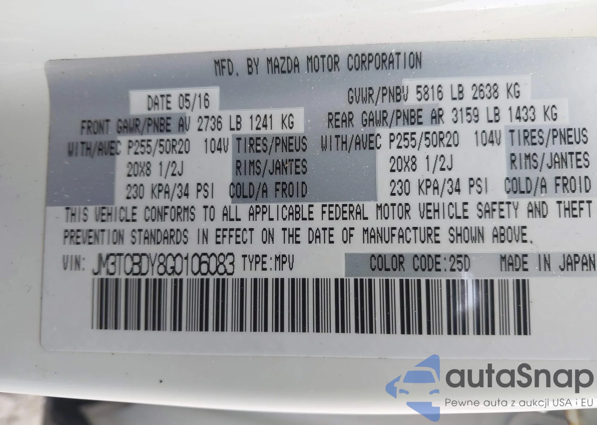Samochód Mazda CX-9 2016 (VIN JM3TCBDY8G0106083) nie był wcześniej licytowany. Dokumenty są czyste, przebieg odpowiada lub jest niższy niż średnia rynku. Sprzedaje go firma ubezpieczeniowa – polecamy zakup. Dostawa do portu zajmie ok. 6–8 tygodni.