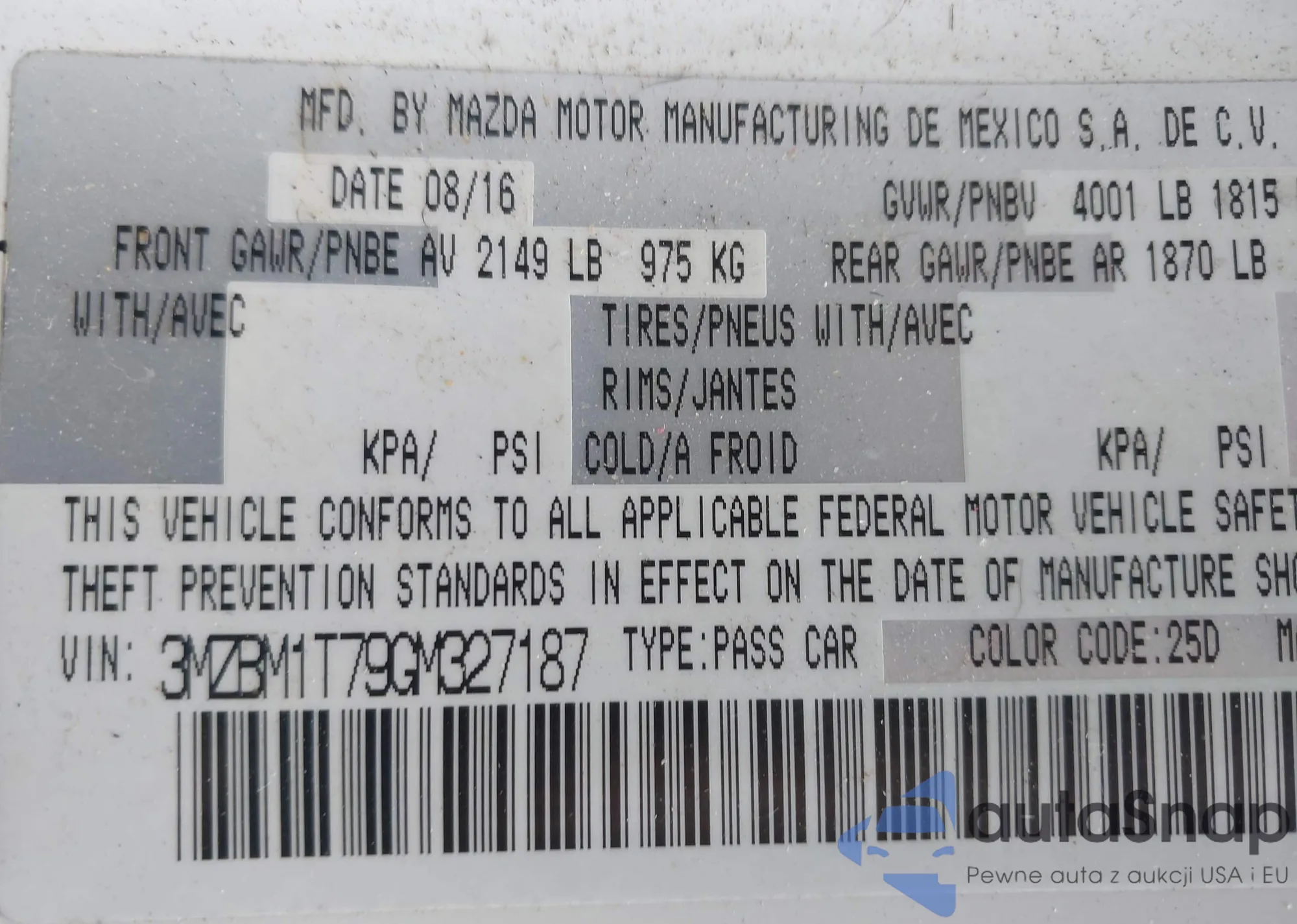 Samochód Mazda 3 2016 (VIN 3MZBM1T79GM327187) nie był wcześniej licytowany. Dokumenty są czyste, przebieg odpowiada lub jest niższy niż średnia rynku. Sprzedaje go firma ubezpieczeniowa – polecamy zakup. Dostawa do portu zajmie ok. 6–8 tygodni.