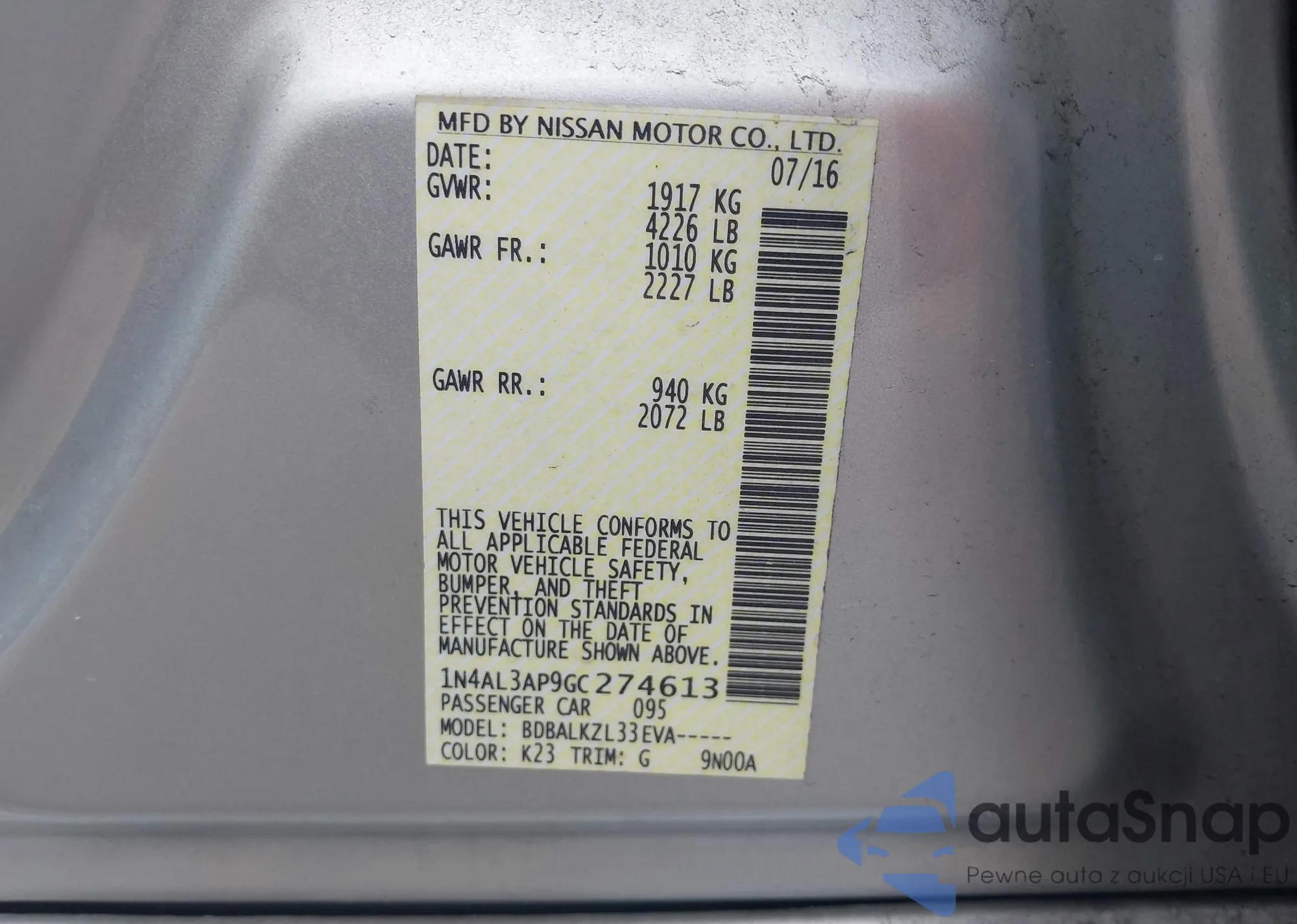 Samochód Nissan Altima 2016 (VIN 1N4AL3AP9GC274613) nie był wcześniej licytowany. Dokumenty są czyste, przebieg odpowiada lub jest niższy niż średnia rynku. Sprzedaje go firma ubezpieczeniowa – polecamy zakup. Dostawa do portu zajmie ok. 6–8 tygodni.