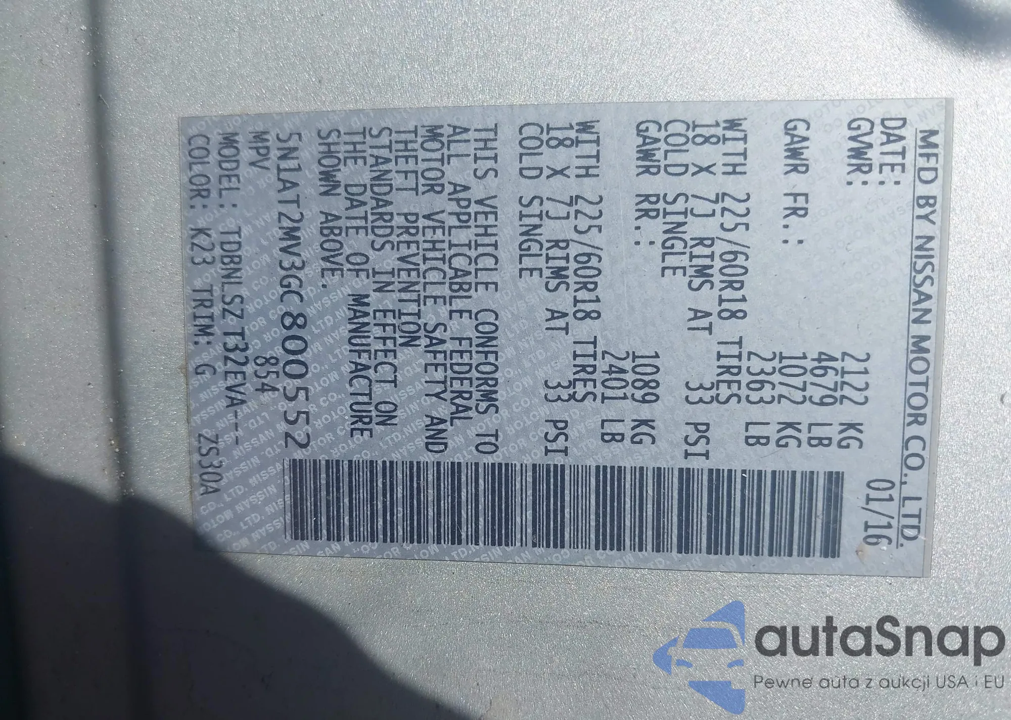 Samochód Nissan Rogue 2016 (VIN 5N1AT2MV3GC800552) sprzedaje go niezweryfikowany sprzedawca. Zalecamy raport Carfax i potwierdzenie możliwości rejestracji pojazdu przed zakupem.