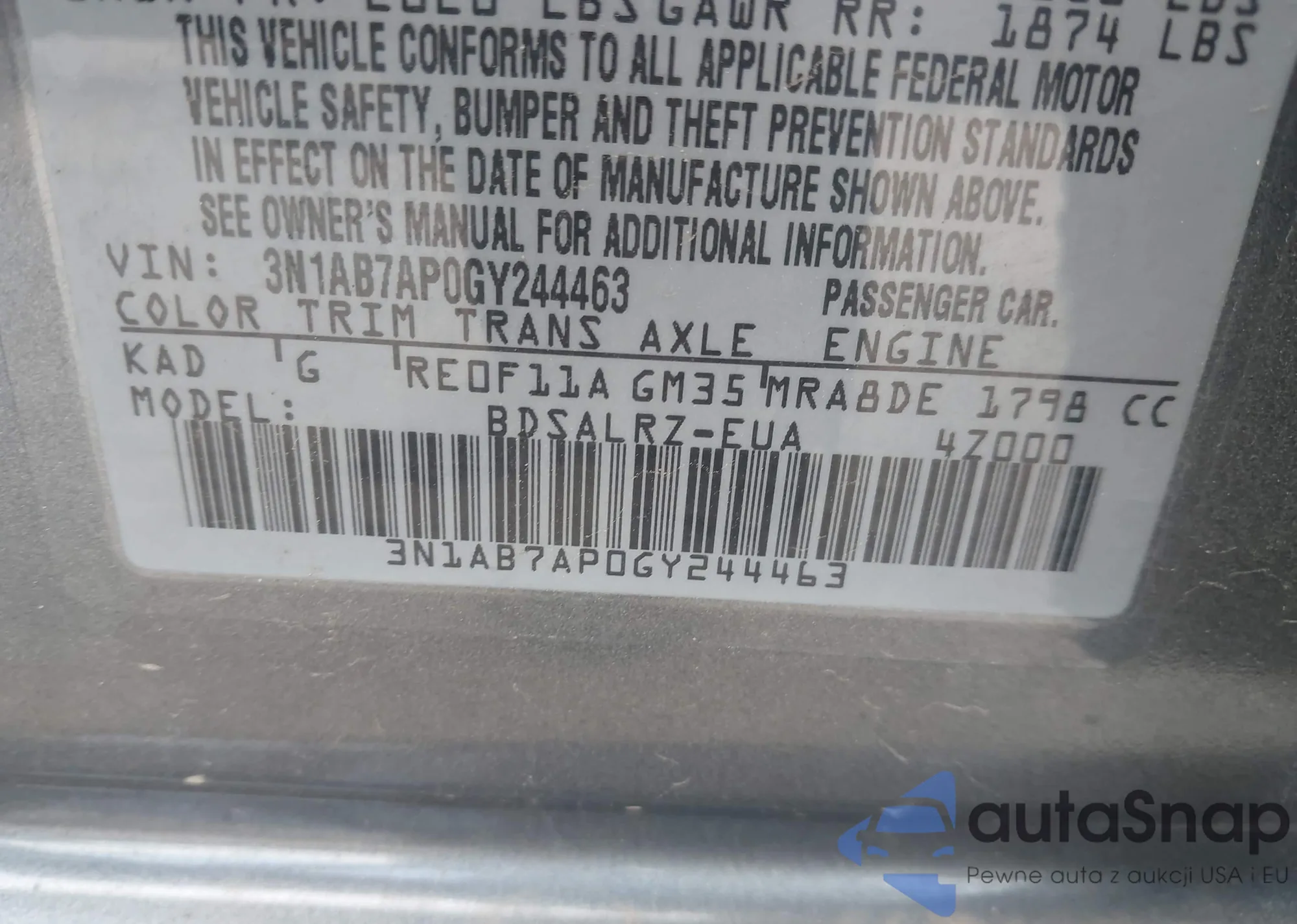 Samochód Nissan Sentra 2016 (VIN 3N1AB7AP0GY244463) nie był wcześniej licytowany. Dokumenty są czyste, przebieg odpowiada lub jest niższy niż średnia rynku. Sprzedaje go firma ubezpieczeniowa – polecamy zakup. Dostawa do portu zajmie ok. 6–8 tygodni.