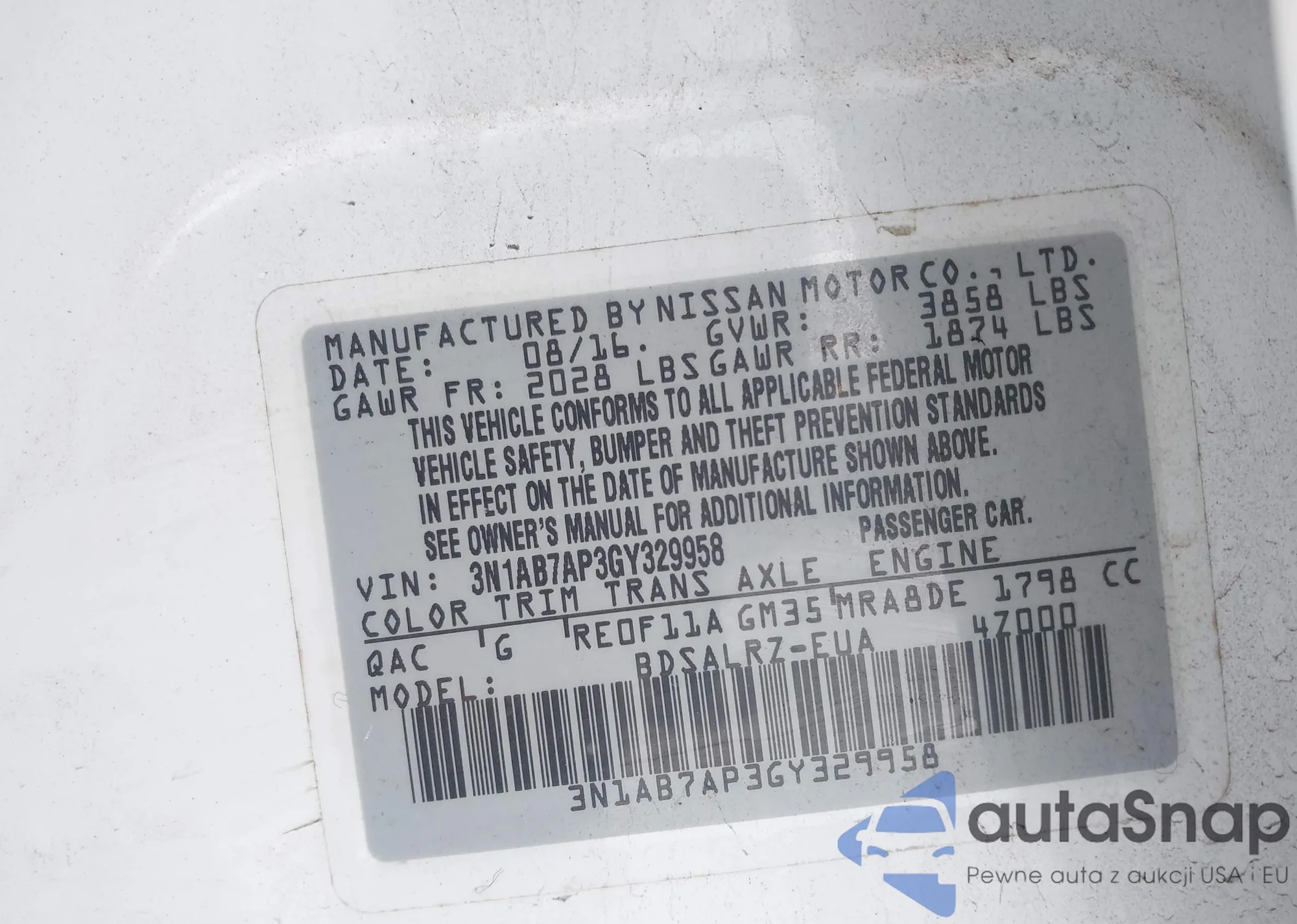 Samochód Nissan Sentra 2016 (VIN 3N1AB7AP3GY329958) nie był wcześniej licytowany. Dokumenty są czyste, przebieg odpowiada lub jest niższy niż średnia rynku. Sprzedaje go firma ubezpieczeniowa – polecamy zakup. Dostawa do portu zajmie ok. 6–8 tygodni.