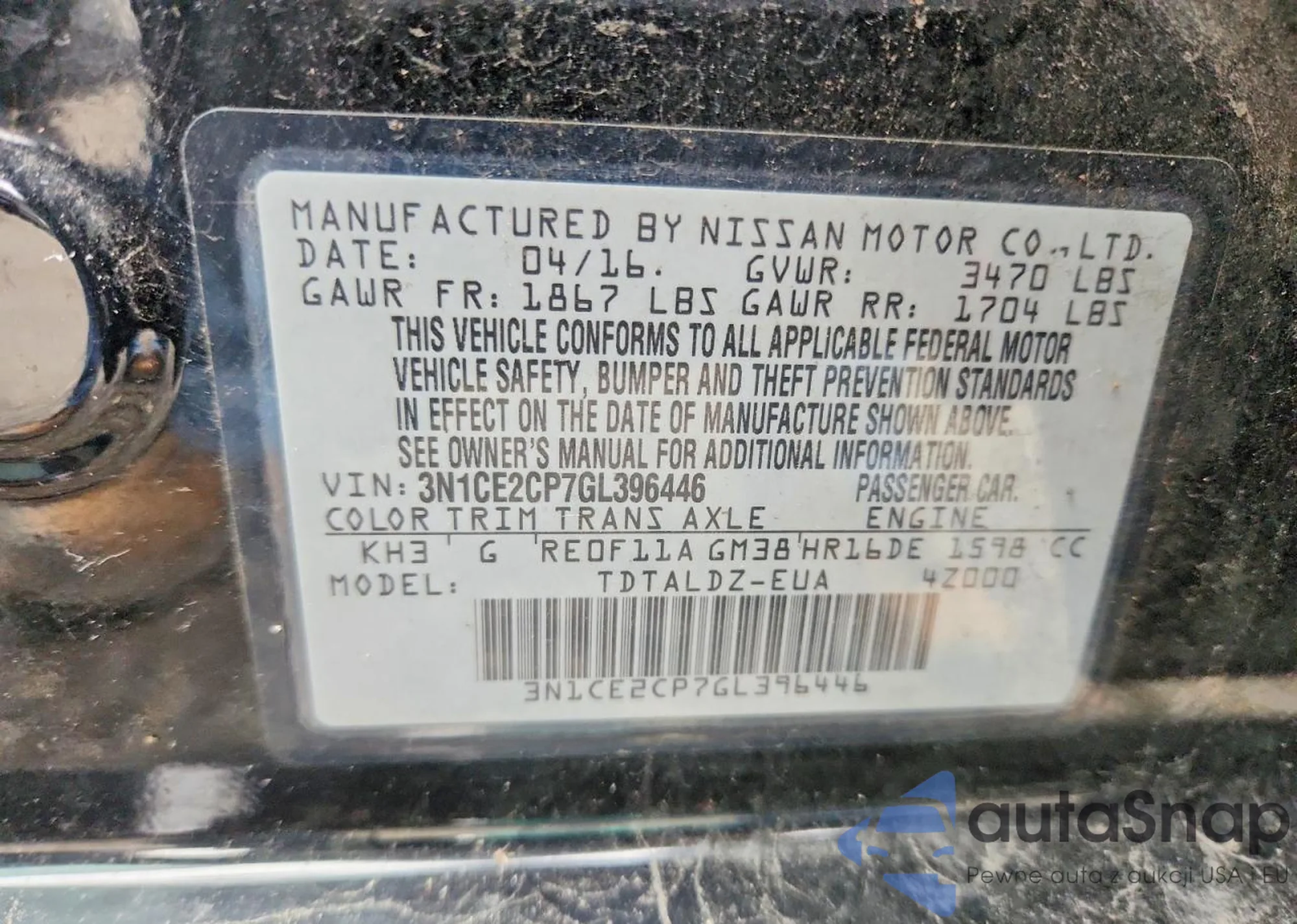 Samochód Nissan Versa 2016 (VIN 3N1CE2CP7GL396446) sprzedaje go niezweryfikowany sprzedawca. Zalecamy raport Carfax i potwierdzenie możliwości rejestracji pojazdu przed zakupem.