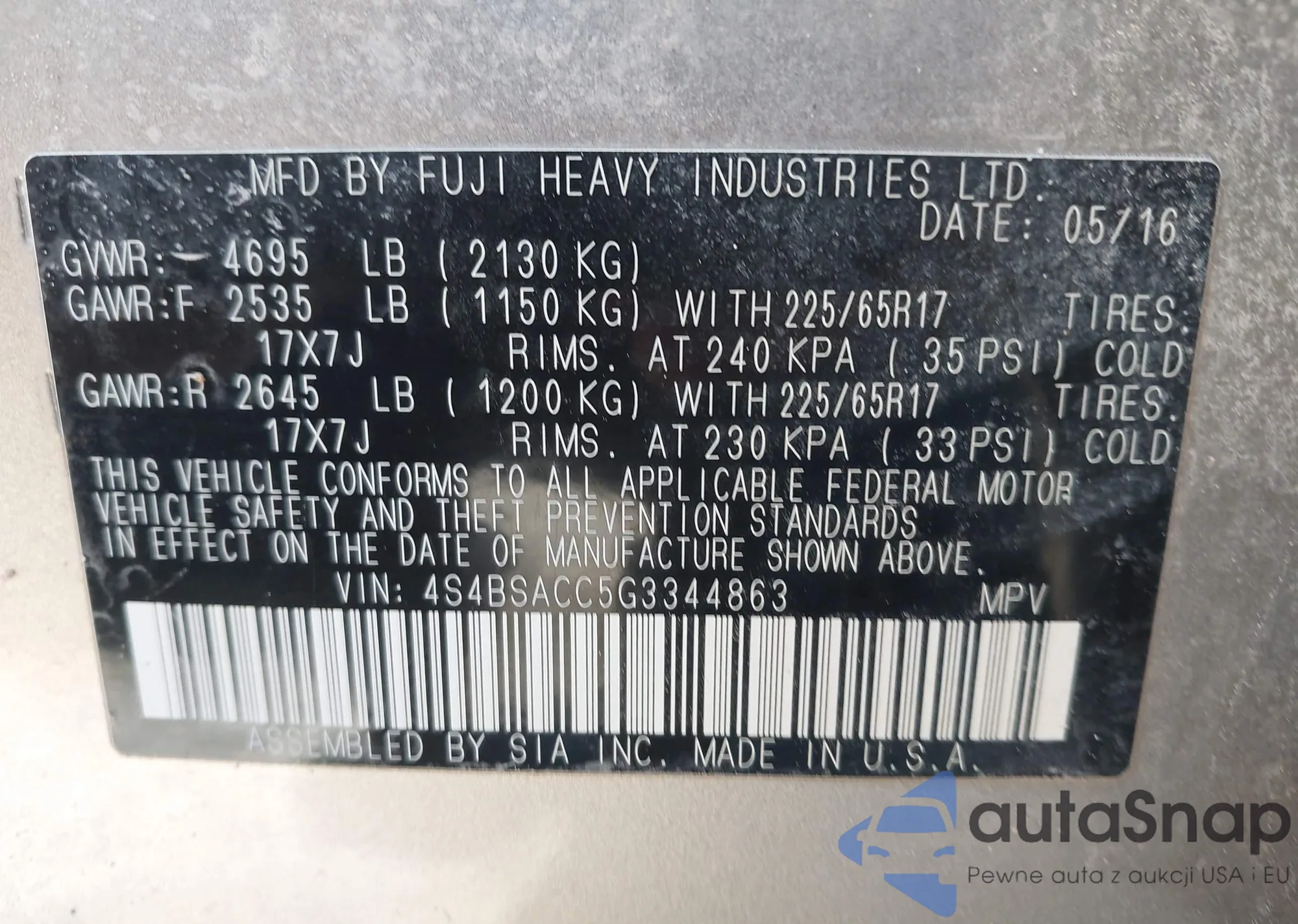 Samochód Subaru Outback 2016 (VIN 4S4BSACC5G3344863) nie był wcześniej licytowany. Dokumenty są czyste, przebieg odpowiada lub jest niższy niż średnia rynku. Sprzedaje go firma ubezpieczeniowa – polecamy zakup. Dostawa do portu zajmie ok. 6–8 tygodni.