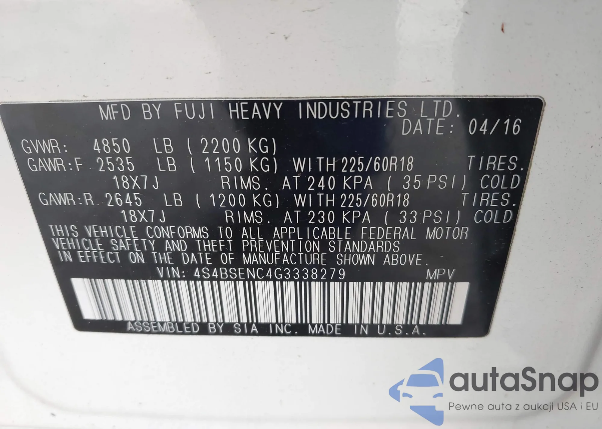 Samochód Subaru Outback 2016 (VIN 4S4BSENC4G3328271) sprzedaje go niezweryfikowany sprzedawca. Zalecamy raport Carfax i potwierdzenie możliwości rejestracji pojazdu przed zakupem.