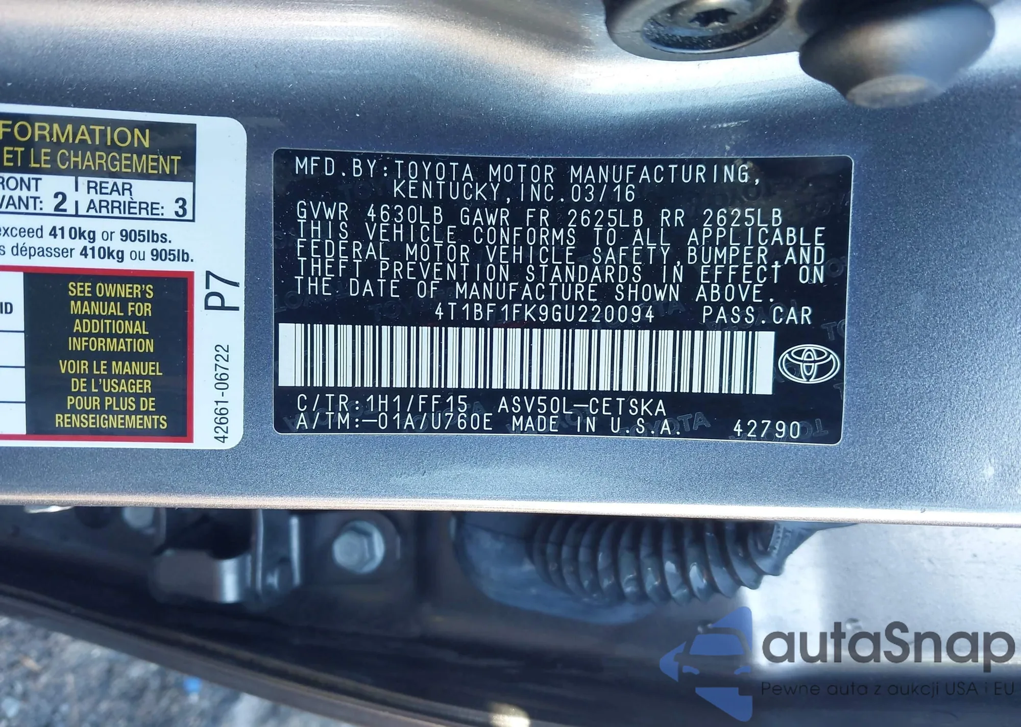 Samochód Toyota Camry 2016 (VIN 4T1BF1FK9GU220094) nie był wcześniej licytowany. Dokumenty są czyste, przebieg odpowiada lub jest niższy niż średnia rynku. Sprzedaje go firma ubezpieczeniowa – polecamy zakup. Dostawa do portu zajmie ok. 6–8 tygodni.