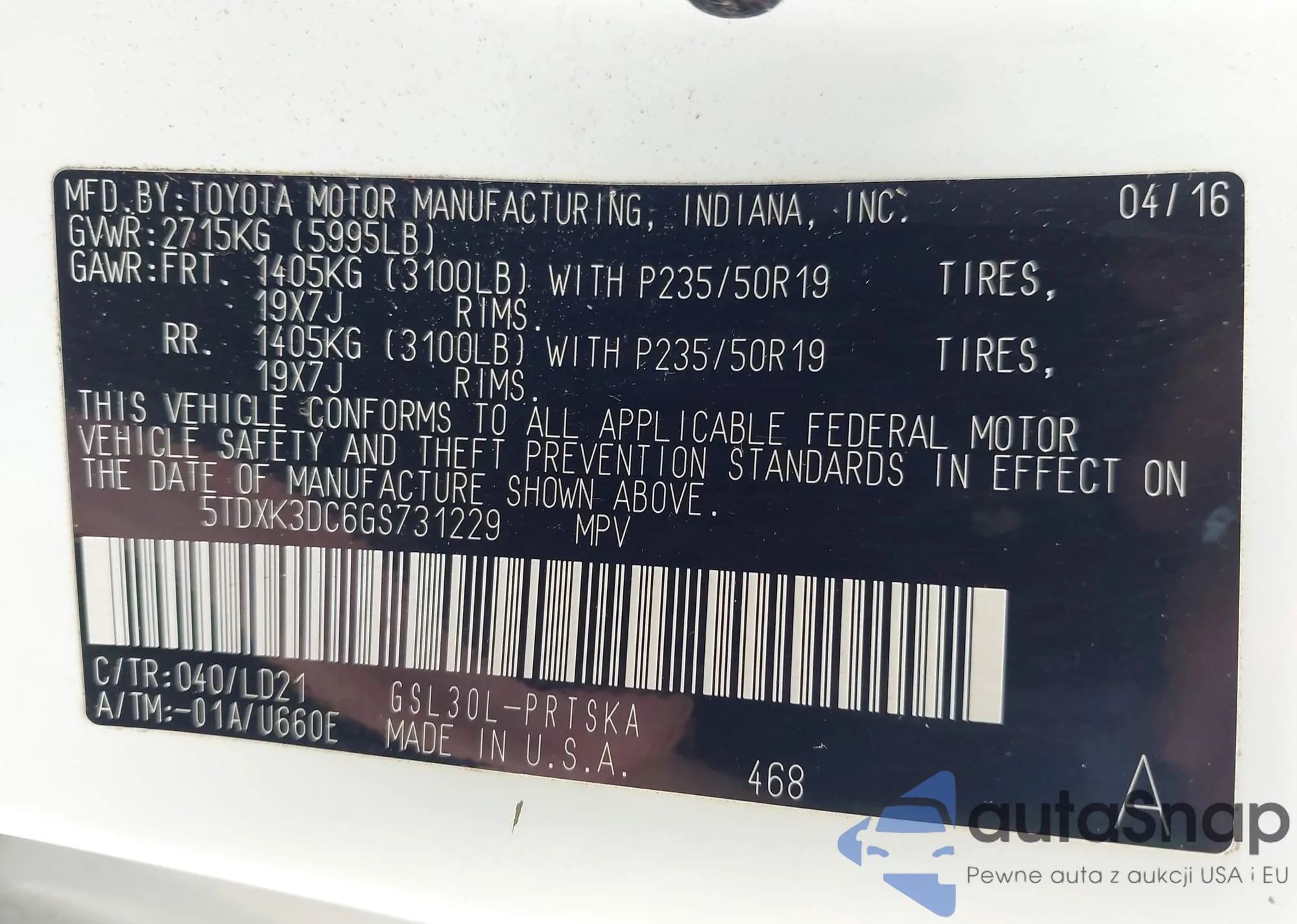 • VIN: 5TDXK3DC6GS731229