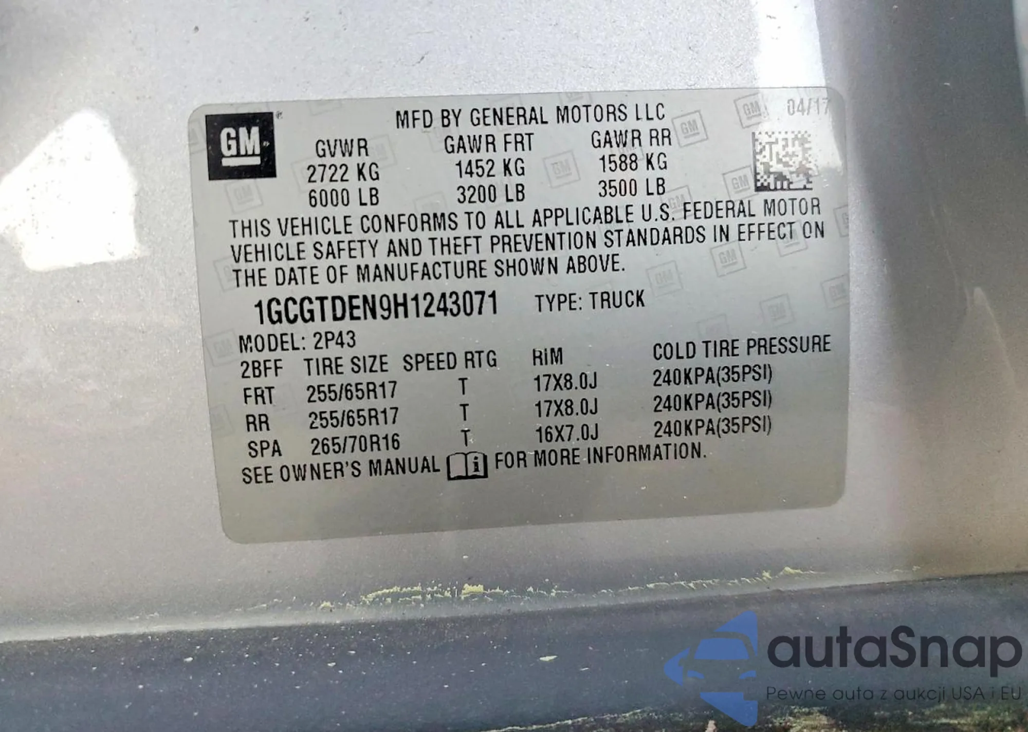 • VIN: 1GCGTDEN9H1243071