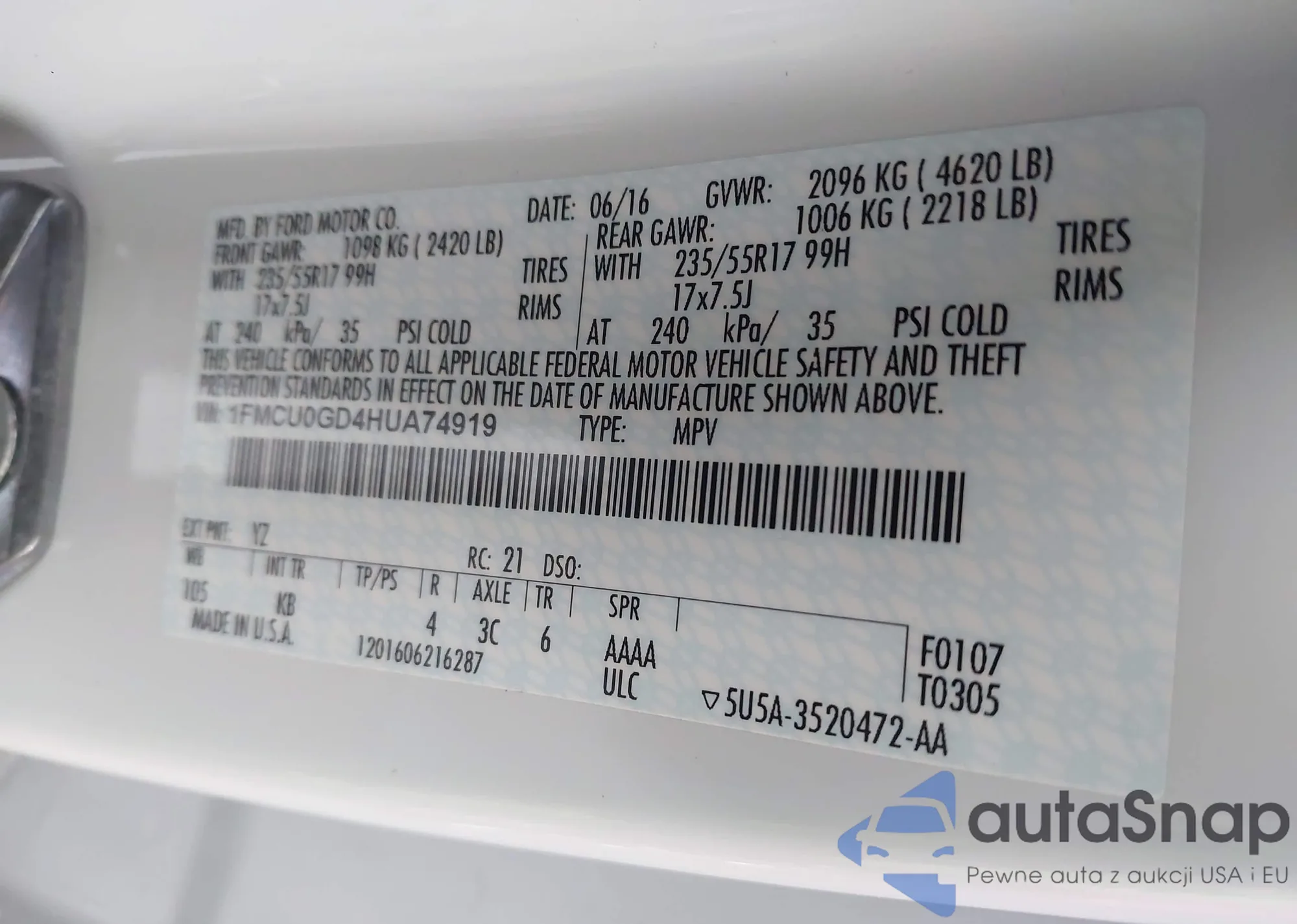 Samochód Ford Escape 2017 (VIN 1FMCU0GD4HUA74919) był już licytowany 1 razy i/lub sprzedaje go niezweryfikowany sprzedawca. Zalecamy raport Carfax i potwierdzenie możliwości rejestracji pojazdu przed zakupem.